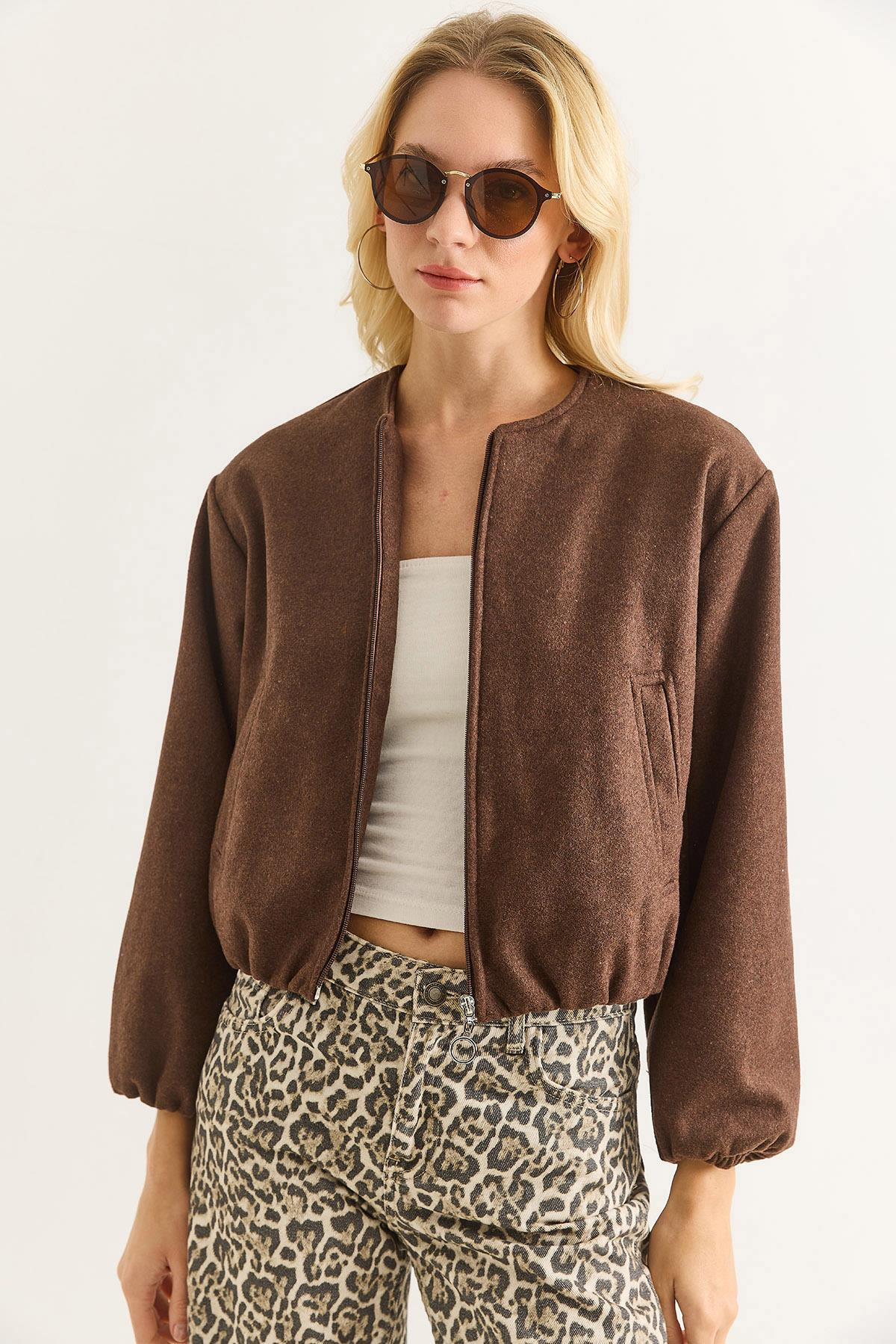 Kadın Bomber Cepli Fermuarlı Ceket Kahverengi (500828CKTXKHV)