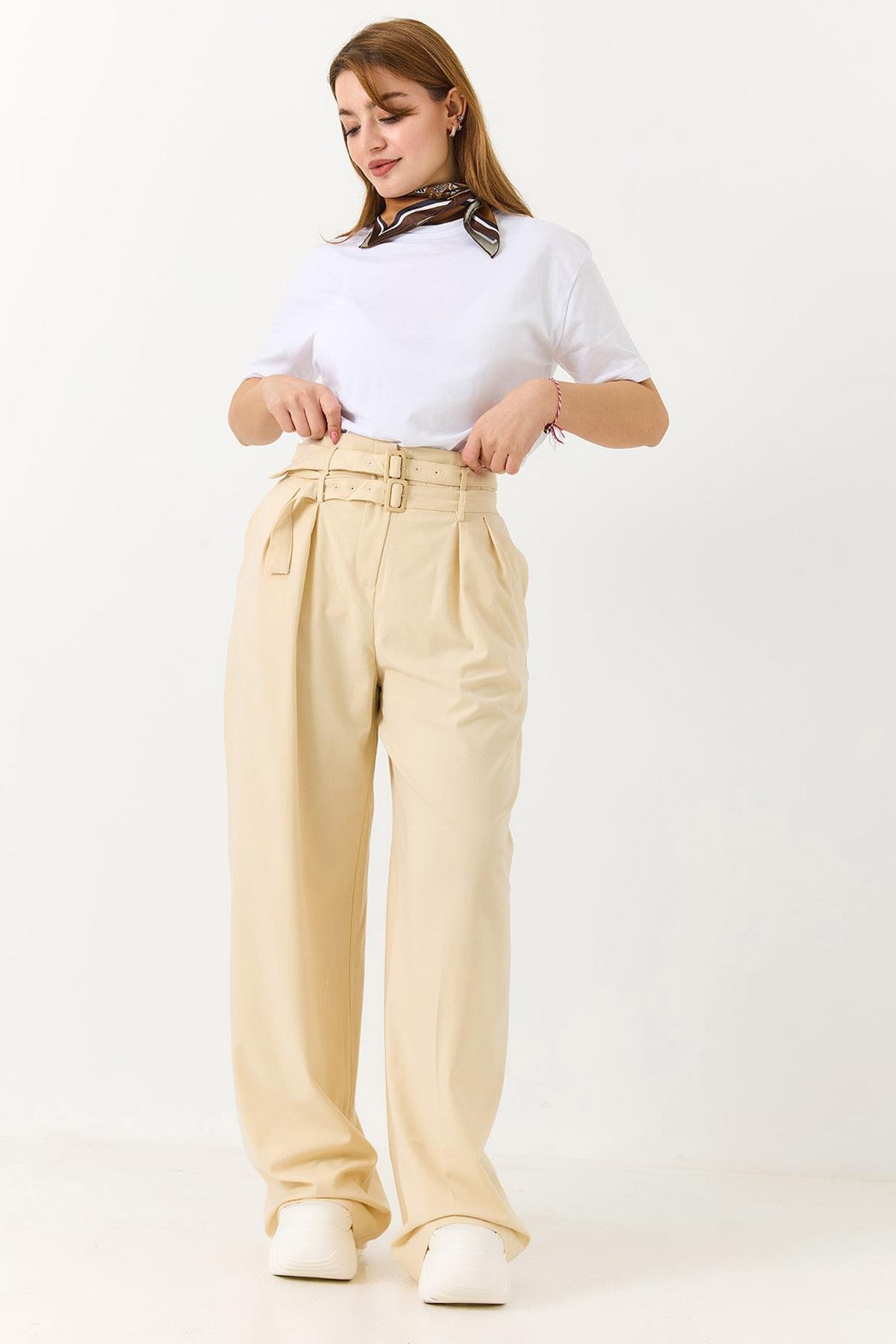 Kadın Çift Kemerli Salaş Kesim Bol Paça Pantolon Bej (255191PNTXBEJ)