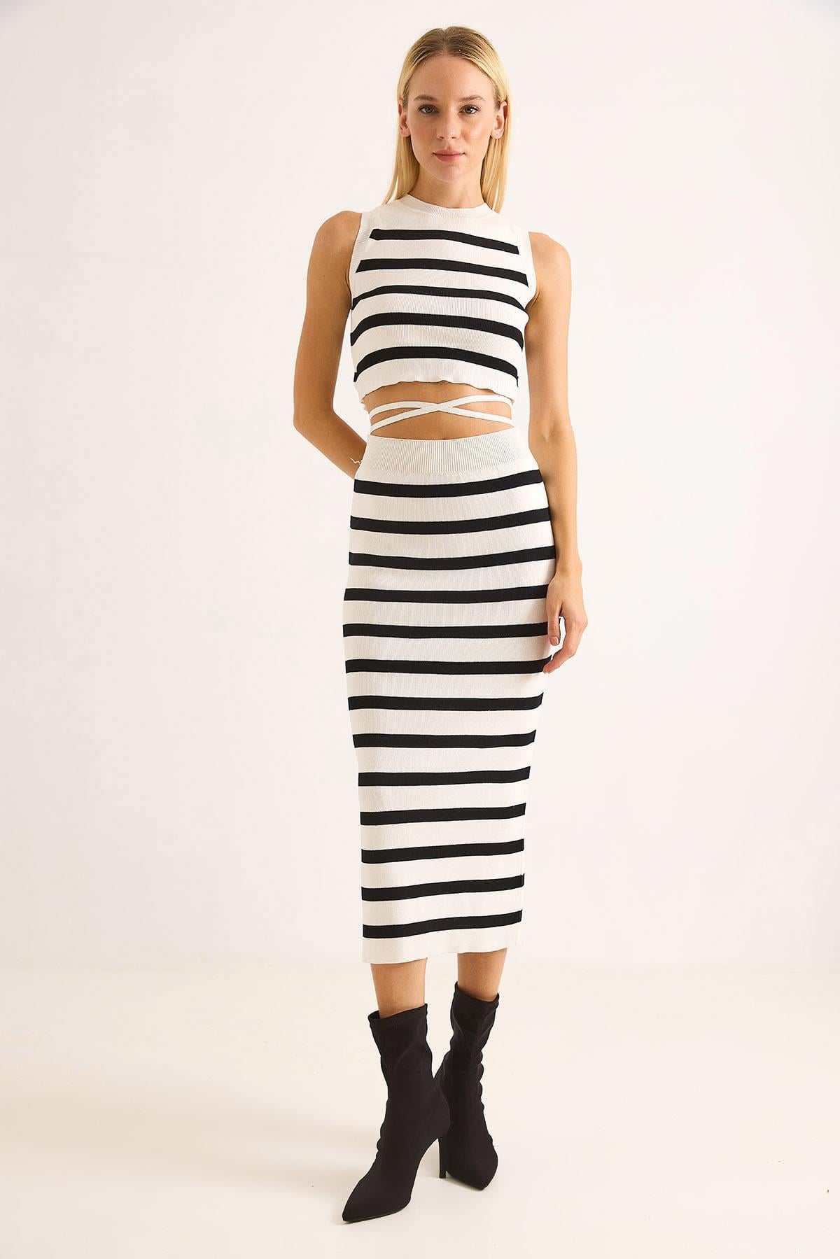 Kadın Çizgi Desenli Etek Crop İp Bağlamalı Beyaz Takım (500768TKMXBYZ)