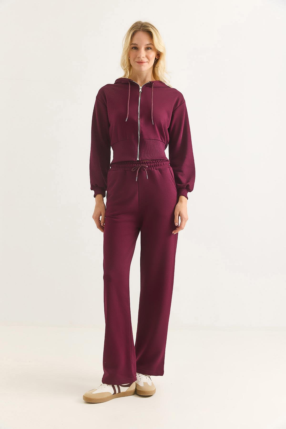 Kadın Crop Hırkalı Üç İplik Şardonsuz Eşofman Takımı Bordo (500818EŞFXBRD)