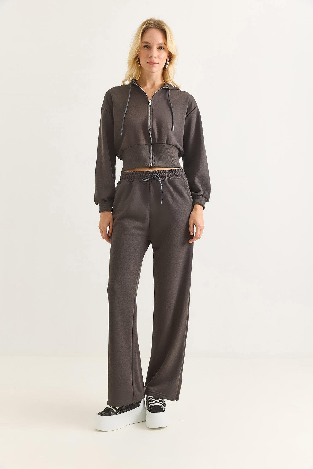 Kadın Crop Hırkalı Üç İplik Şardonsuz Eşofman Takımı Füme (500818EŞFXFME)