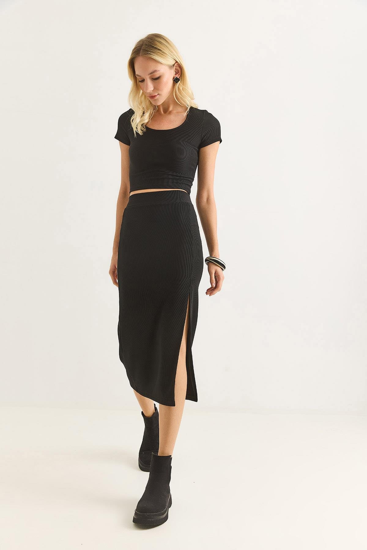 Kadın Crop ve Etek Yırtmaçlı İkili Takım Siyah (500821TKMXSYH)