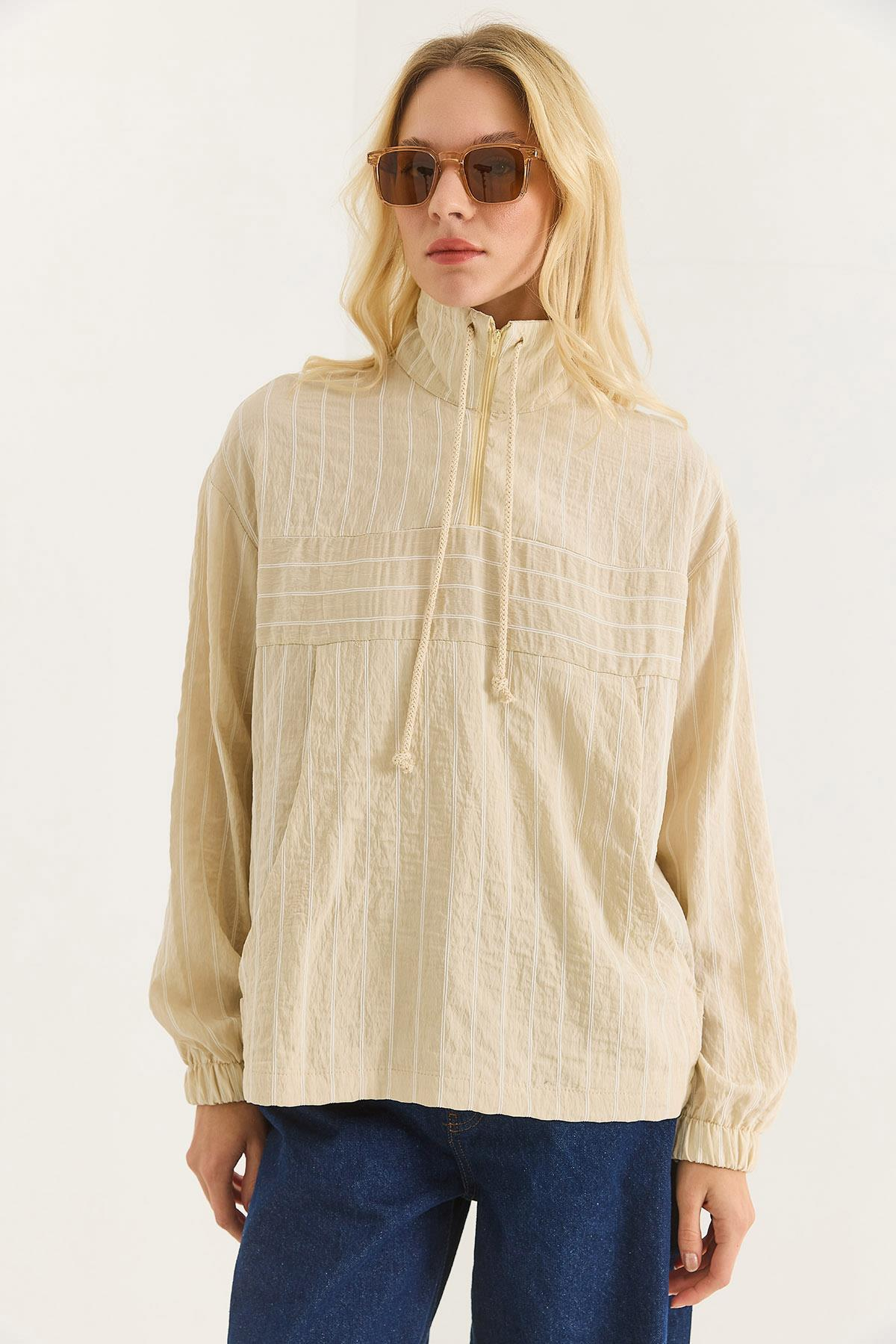 Kadın Dik Yaka Fermuarlı Çizgili Şık Gömlek Ekru (500824GMLXEKR)