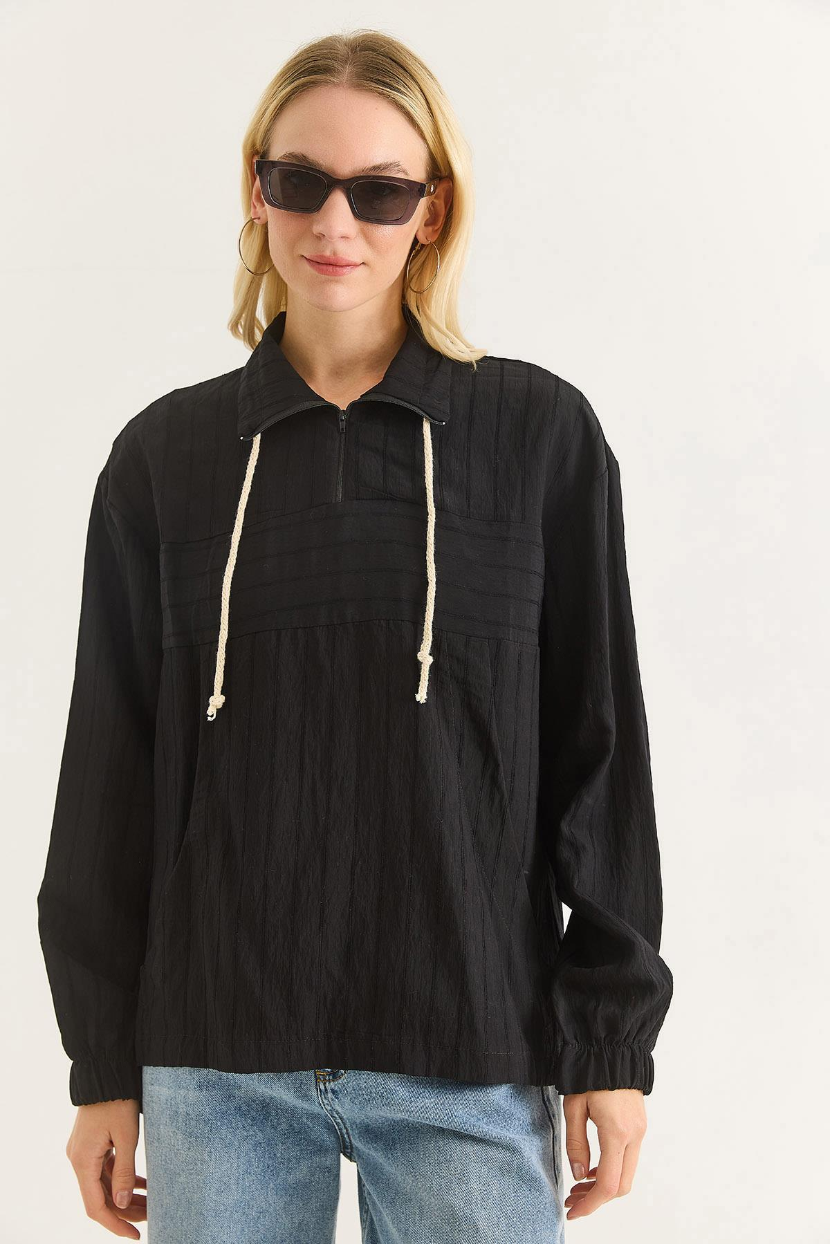 Kadın Dik Yaka Fermuarlı Çizgili Şık Gömlek Siyah (500824GMLXSYH)
