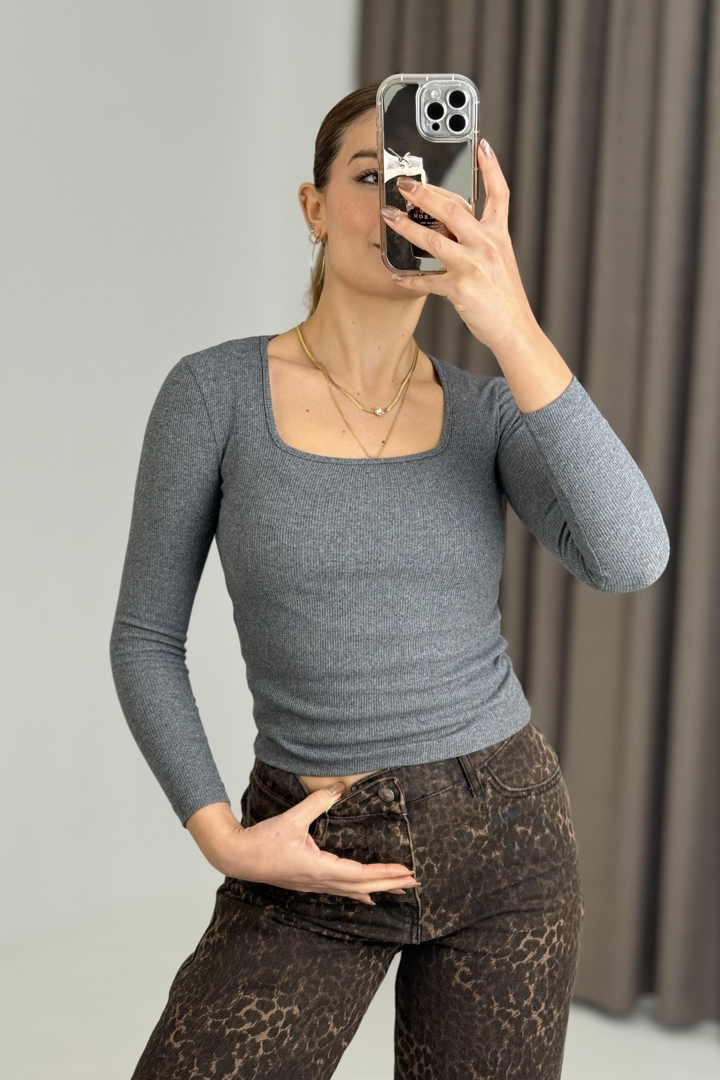 Kadın Fitilli Kare Yaka Uzun Kollu Bluz Gri (500999BLZXGRİ)