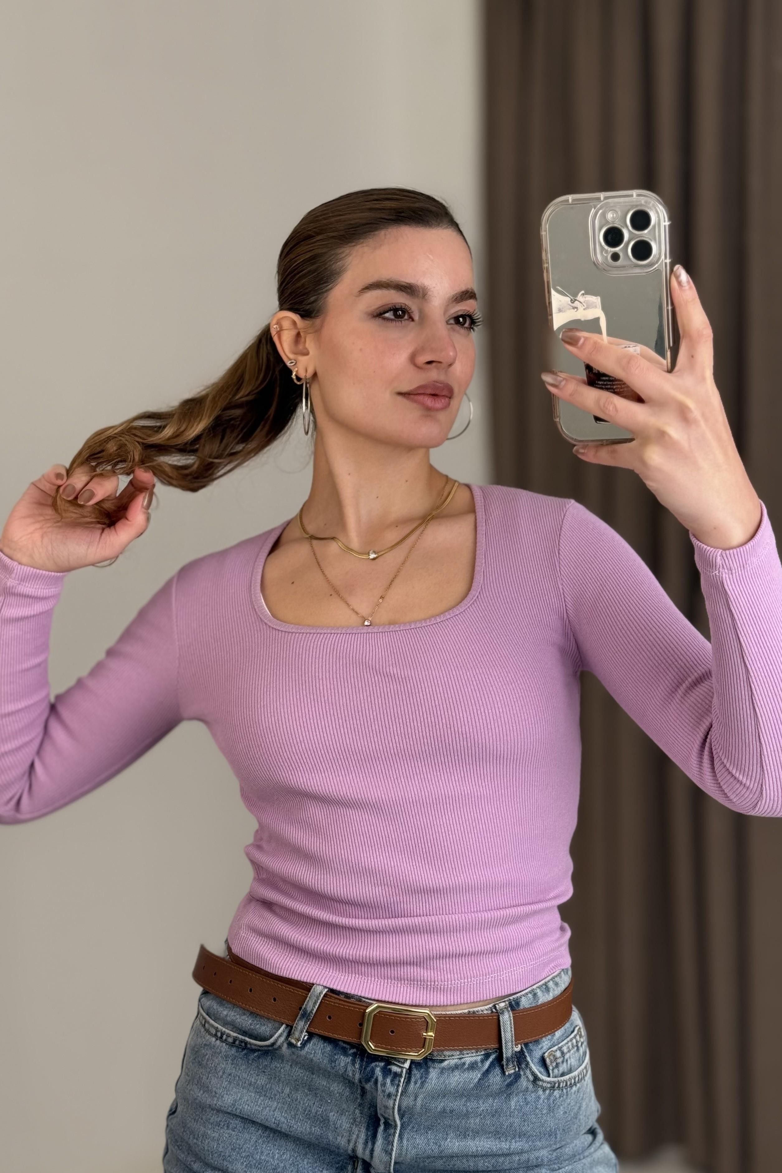 Kadın Fitilli Kare Yaka Uzun Kollu Bluz  Lila
