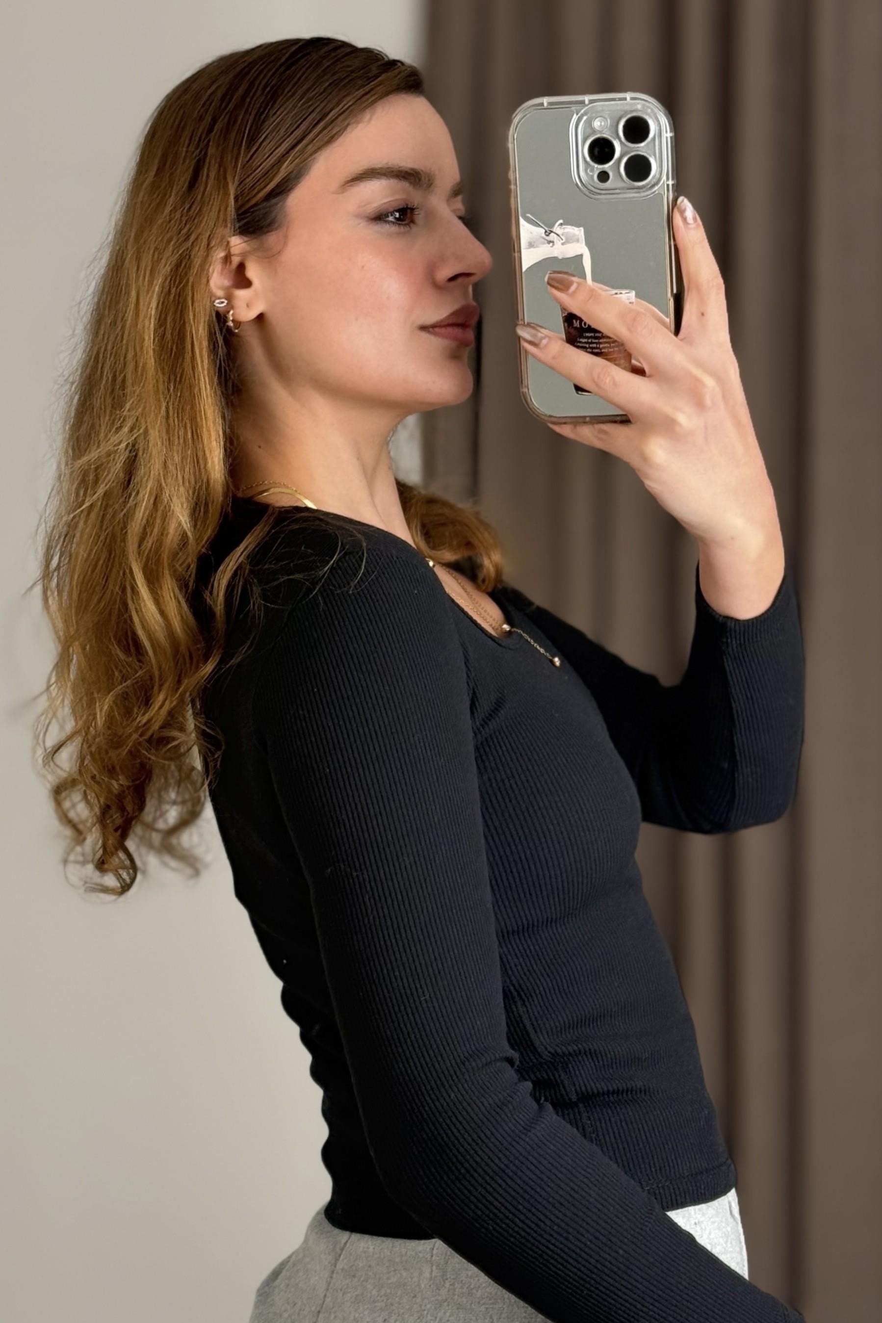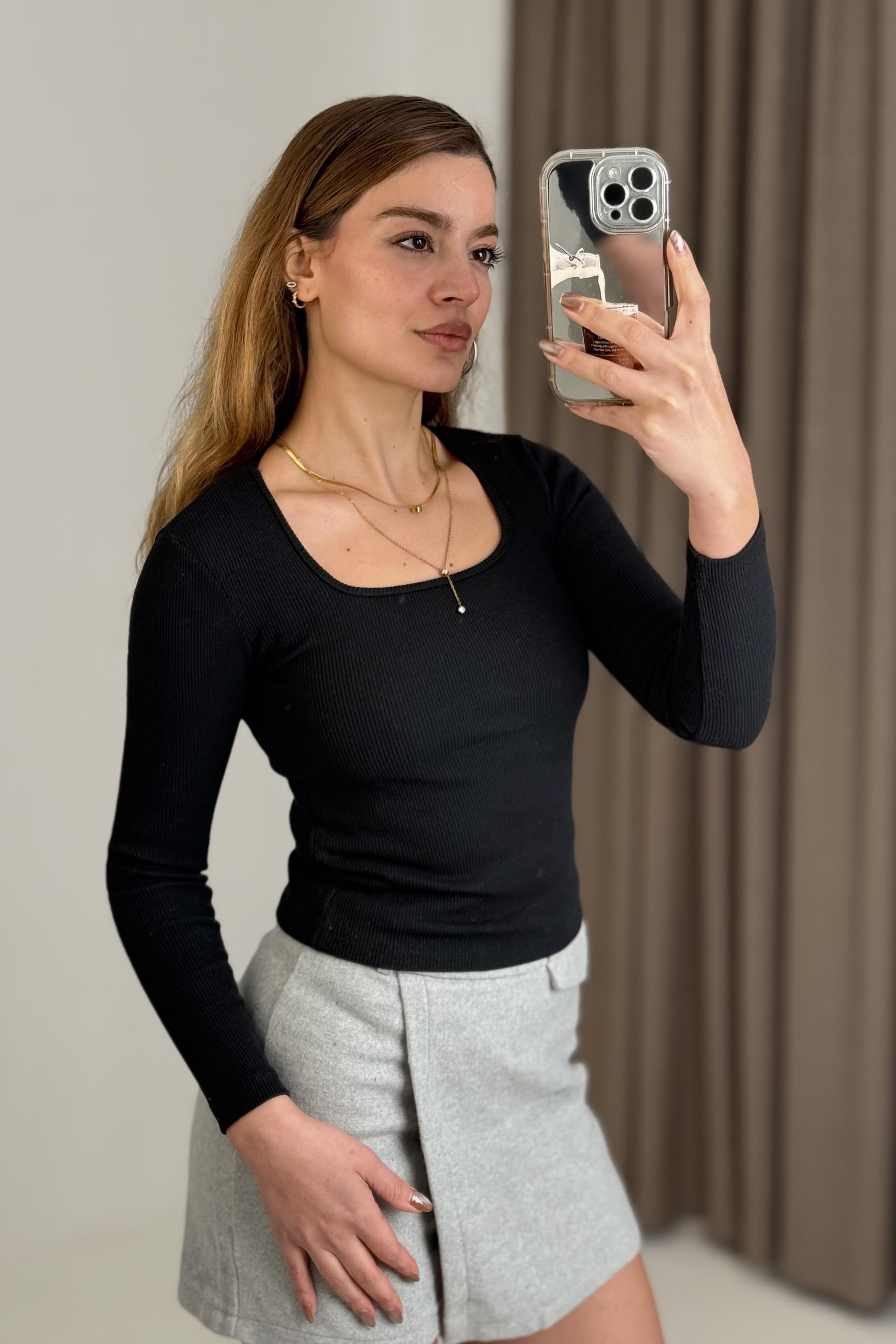 Kadın Fitilli Kare Yaka Uzun Kollu Bluz  Siyah