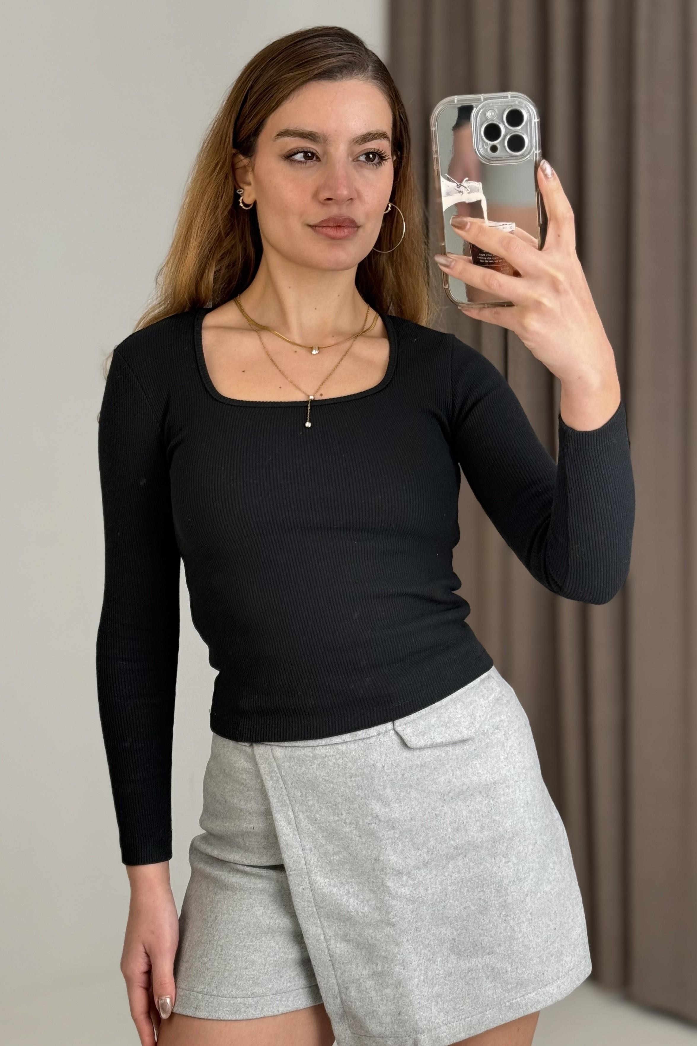 Kadın Fitilli Kare Yaka Uzun Kollu Bluz Siyah (500999BLZXSYH)