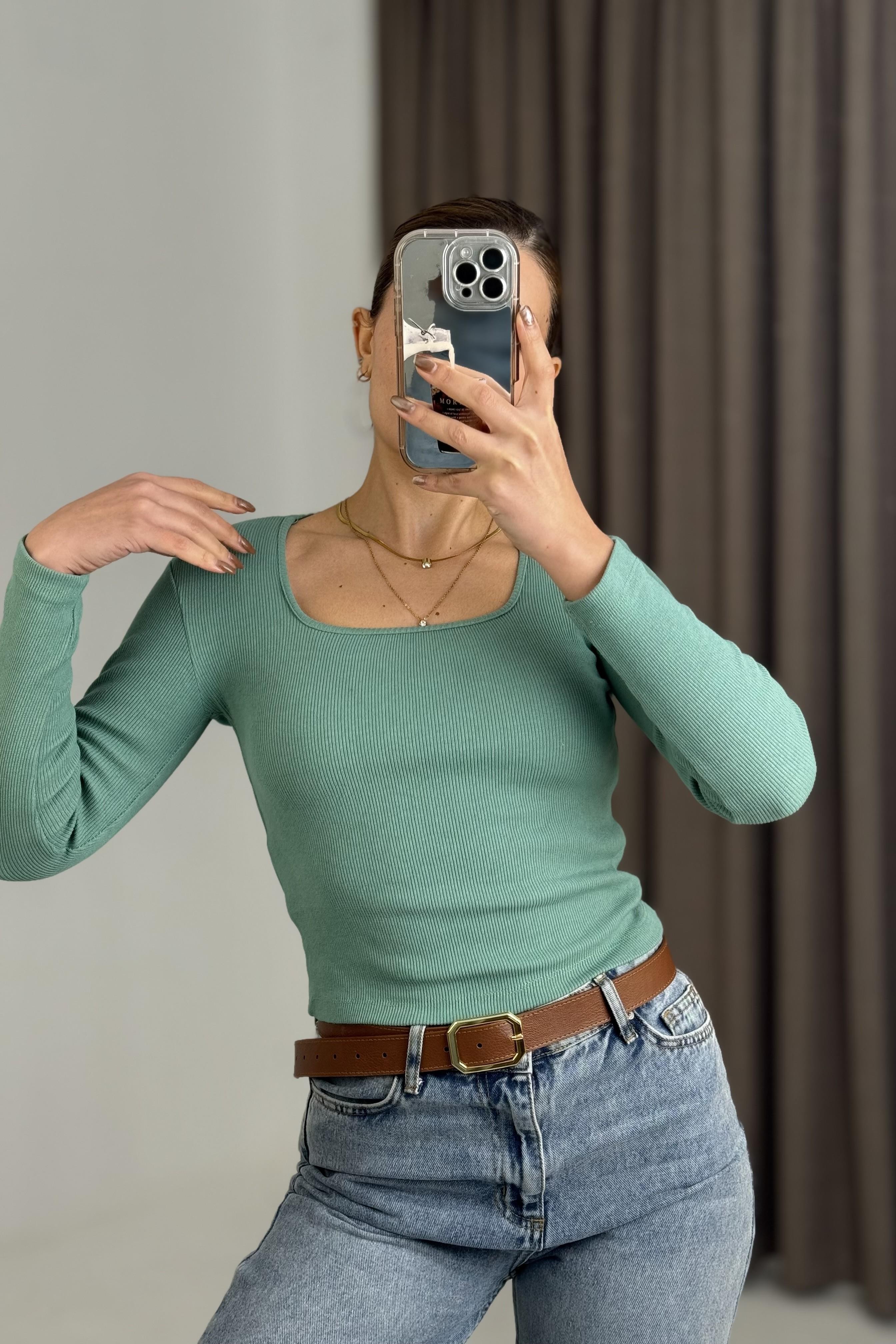 Kadın Fitilli Kare Yaka Uzun Kollu Bluz  Yeşil