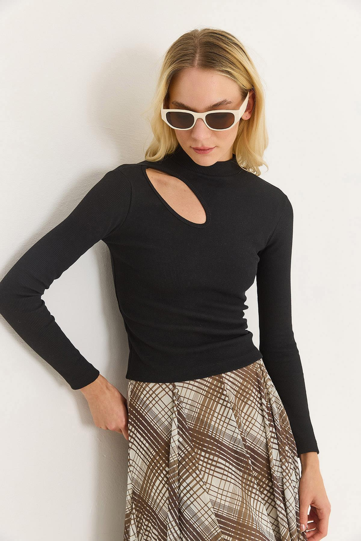 Kadın Fitilli Pencereli Balıkçı Yaka Bluz Siyah