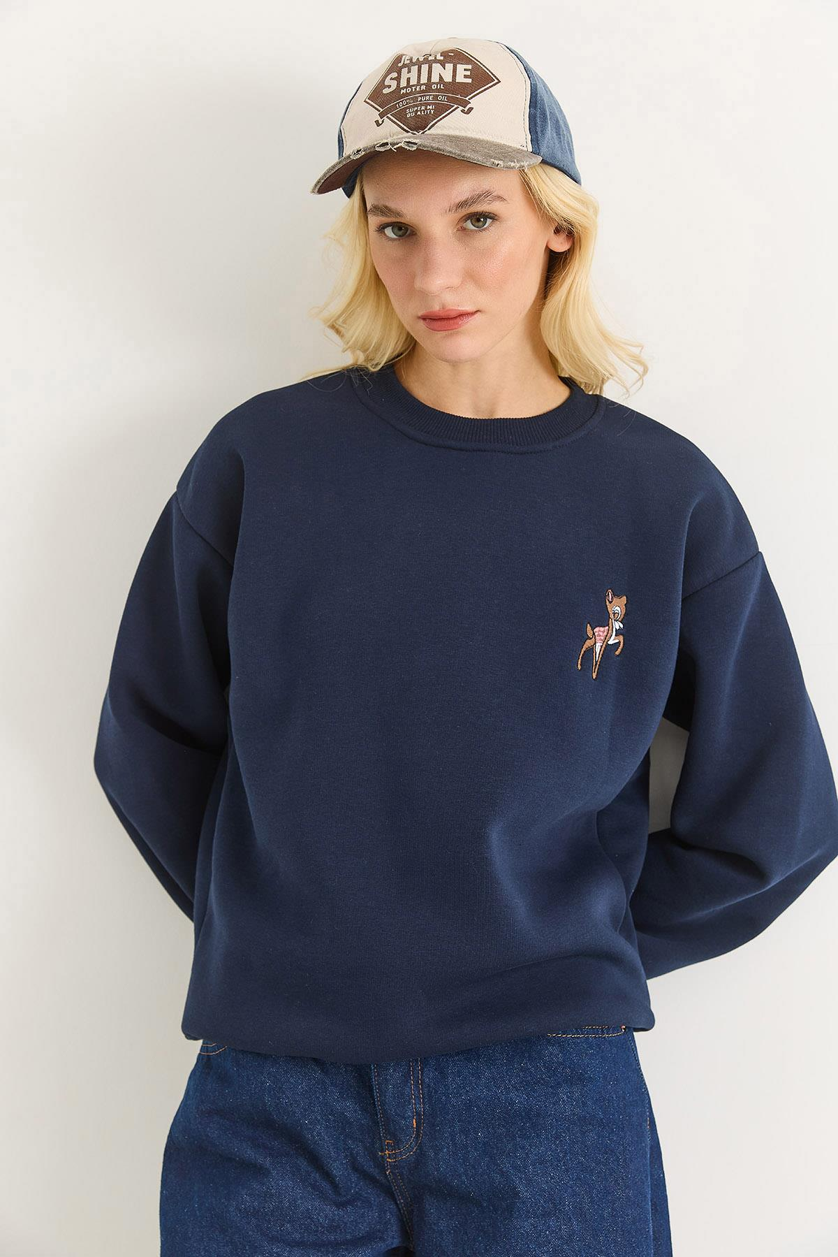 Kadın Geyik Nakışlı Üç İplik Şardonlu Sweatsirt Lacivert