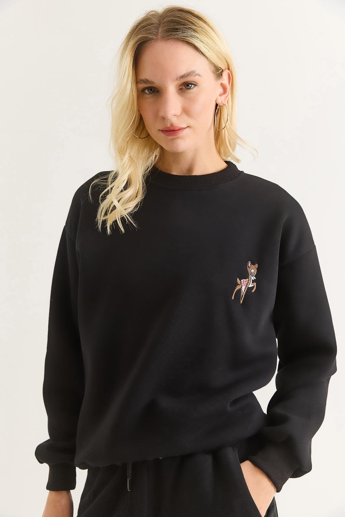 Kadın Geyik Nakışlı Üç İplik Şardonlu Sweatsirt Siyah (500840SWTXSYH)
