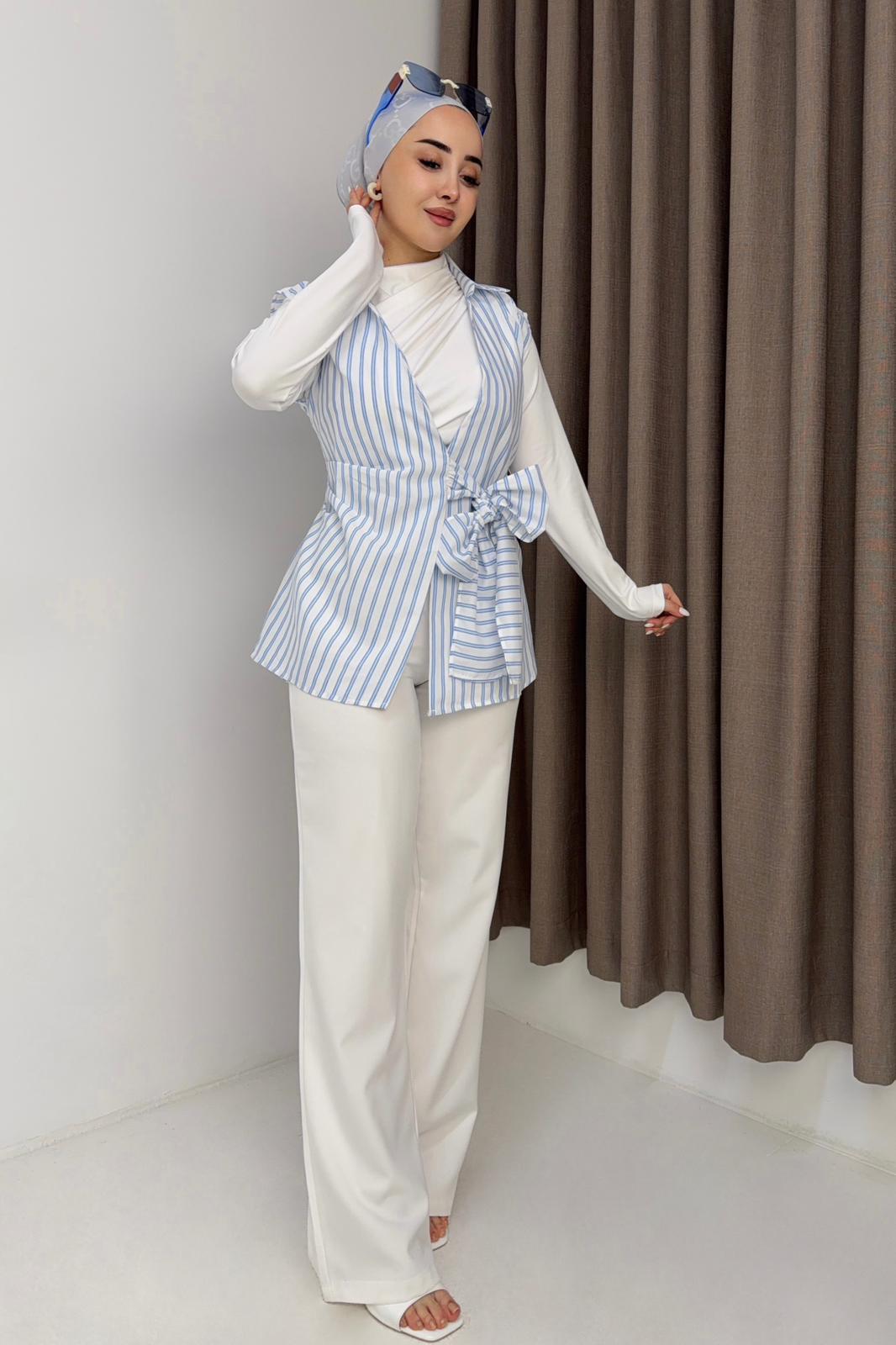 Kadın Gömlek Yaka Belden Bağlamalı Kolsuz Bluz Mavi (255327BLZXMVİ)
