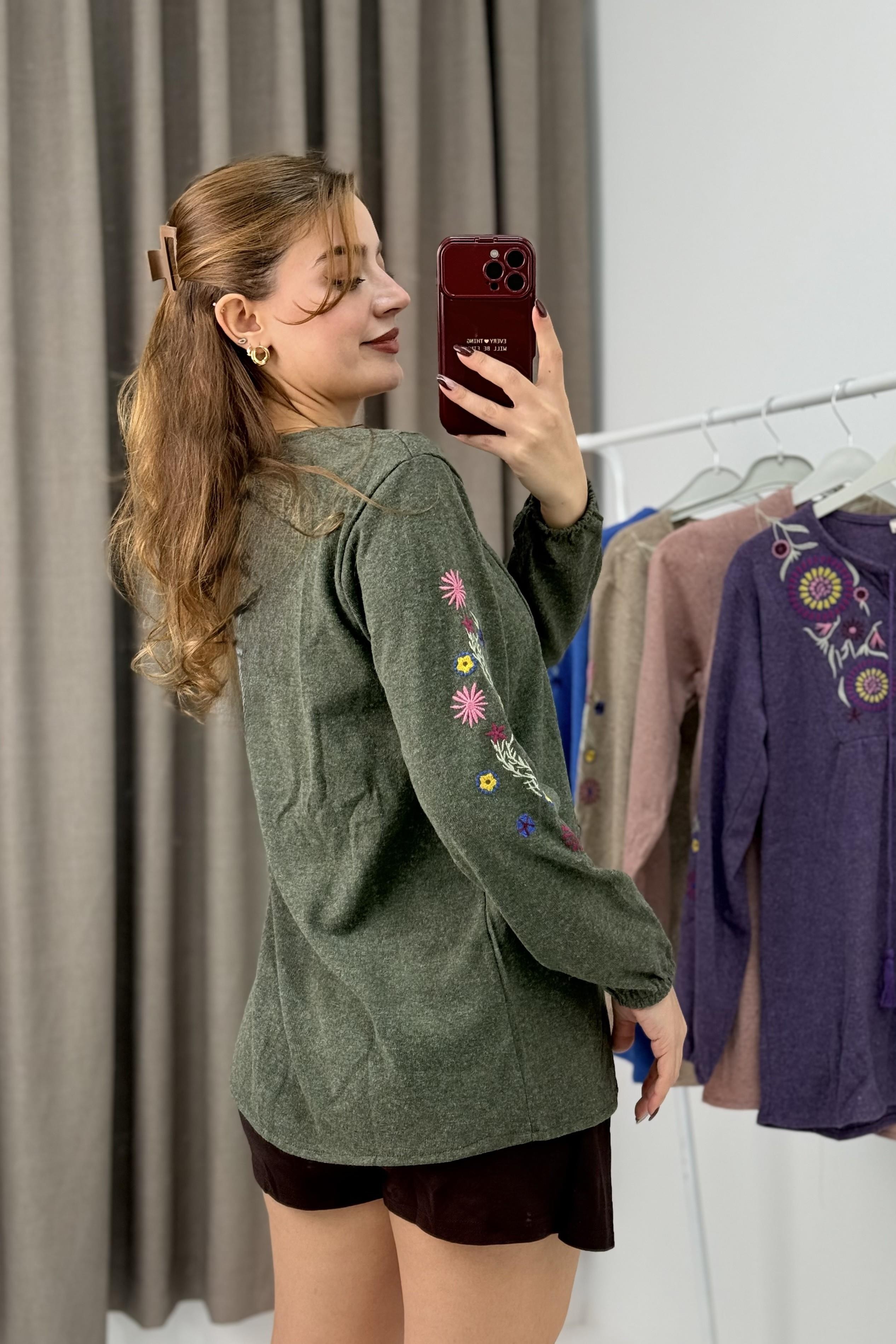 Kadın HakiTriko Etnik Mor Çiçek Nakışlı Kazak