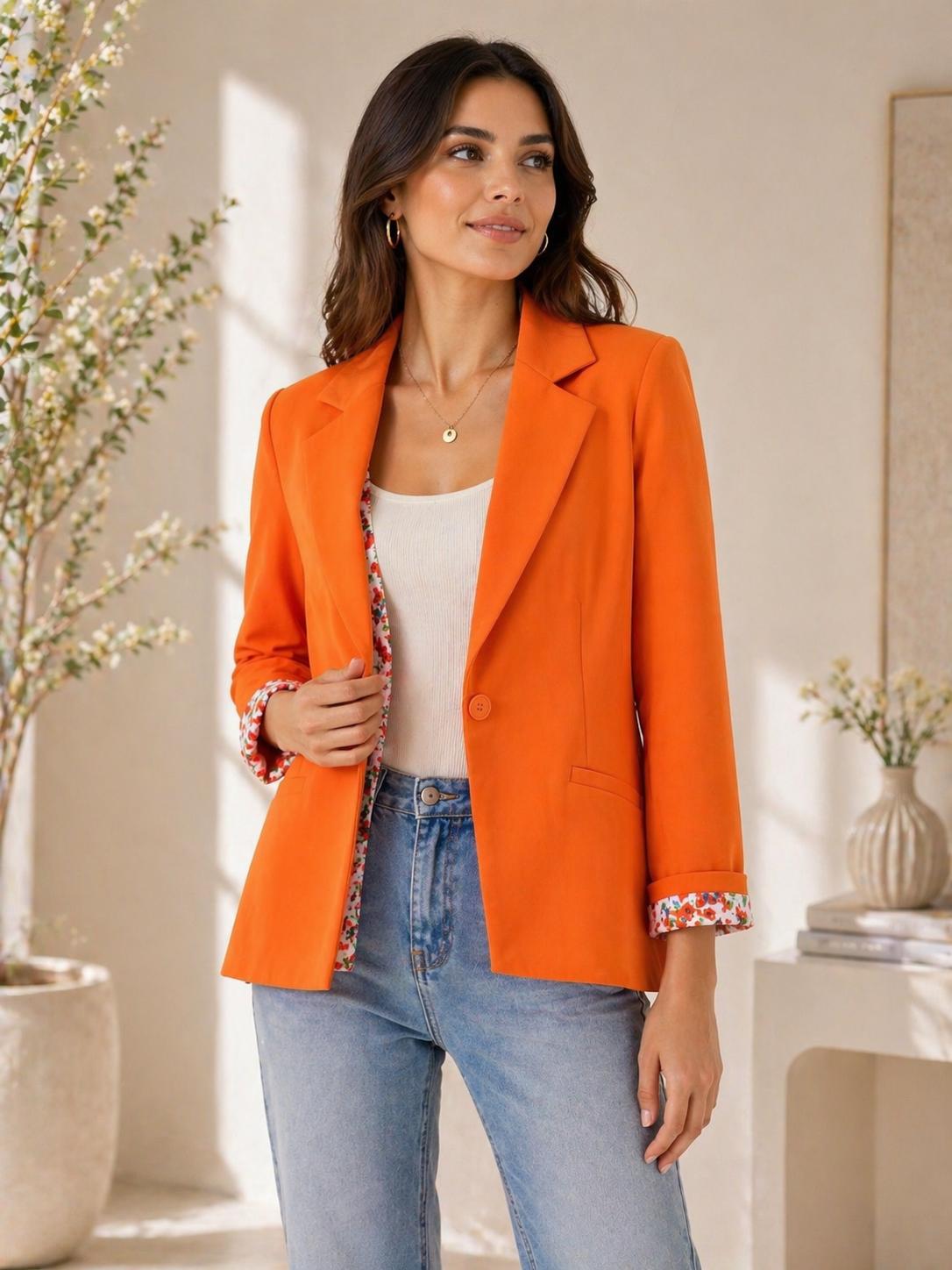 Kadın İç Astarı Çiçek Desenli Tek Düğmeli Ceket Turuncu