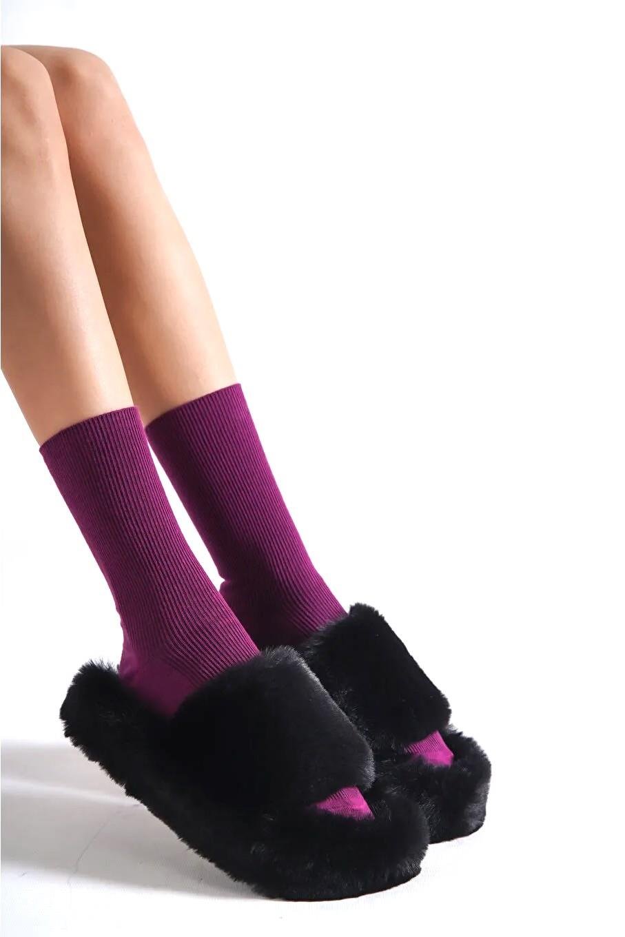 Kadın İçi Tüylü Önü Açık Siyah Ev Terliği