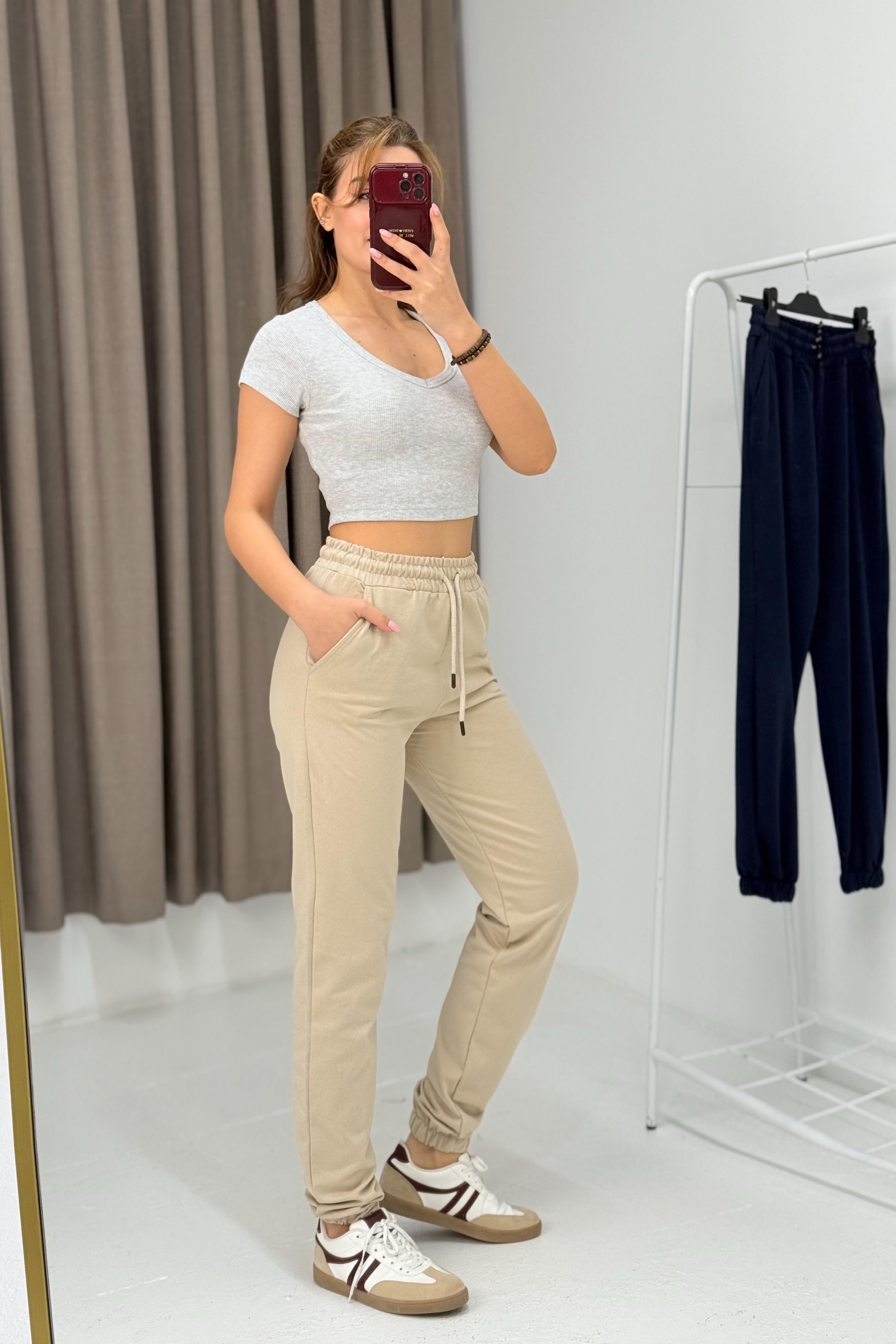 Kadın İki İplik Paçası Lastikli Eşofman Altı Bej