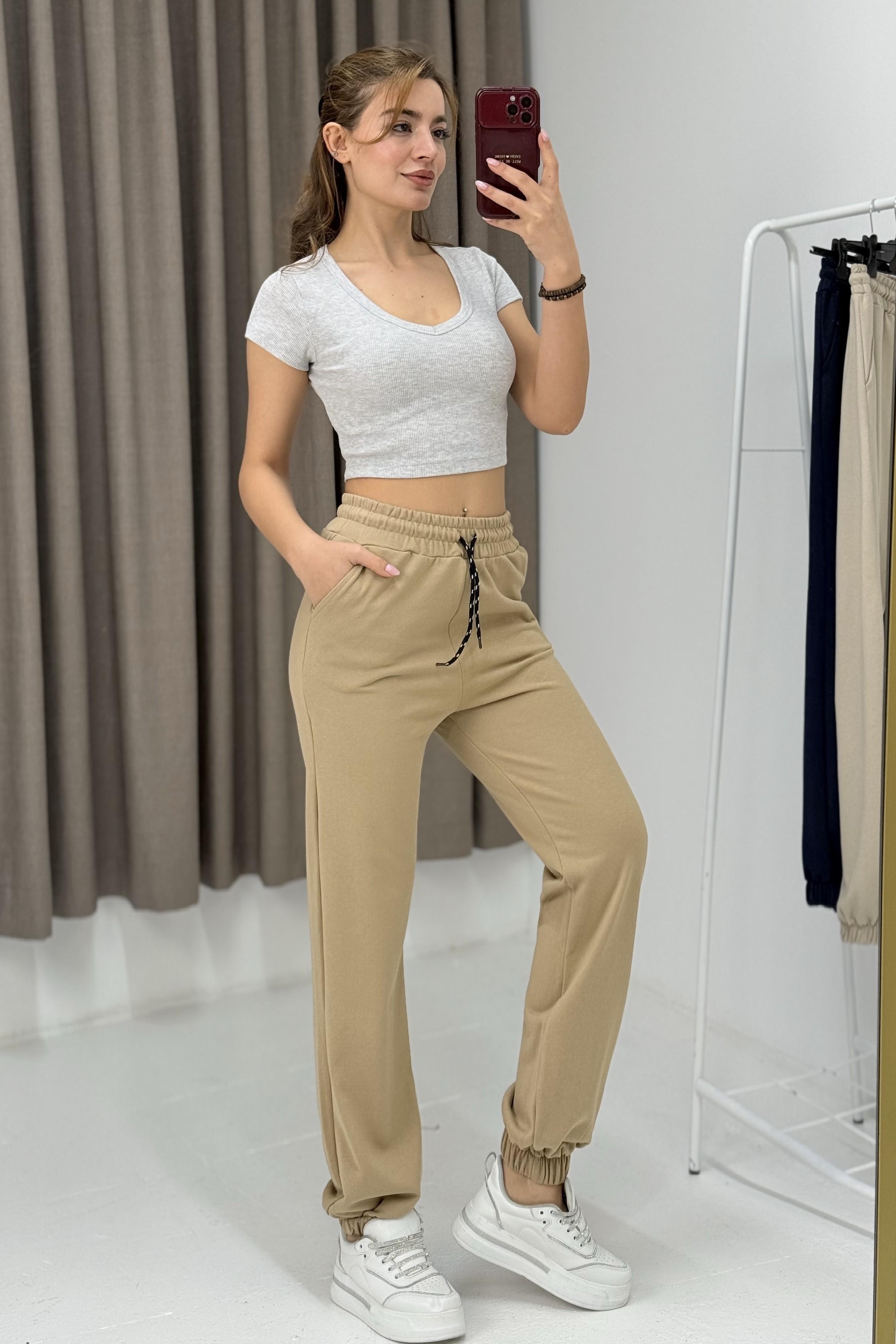 Kadın İki İplik Paçası Lastikli Eşofman Altı Vizon