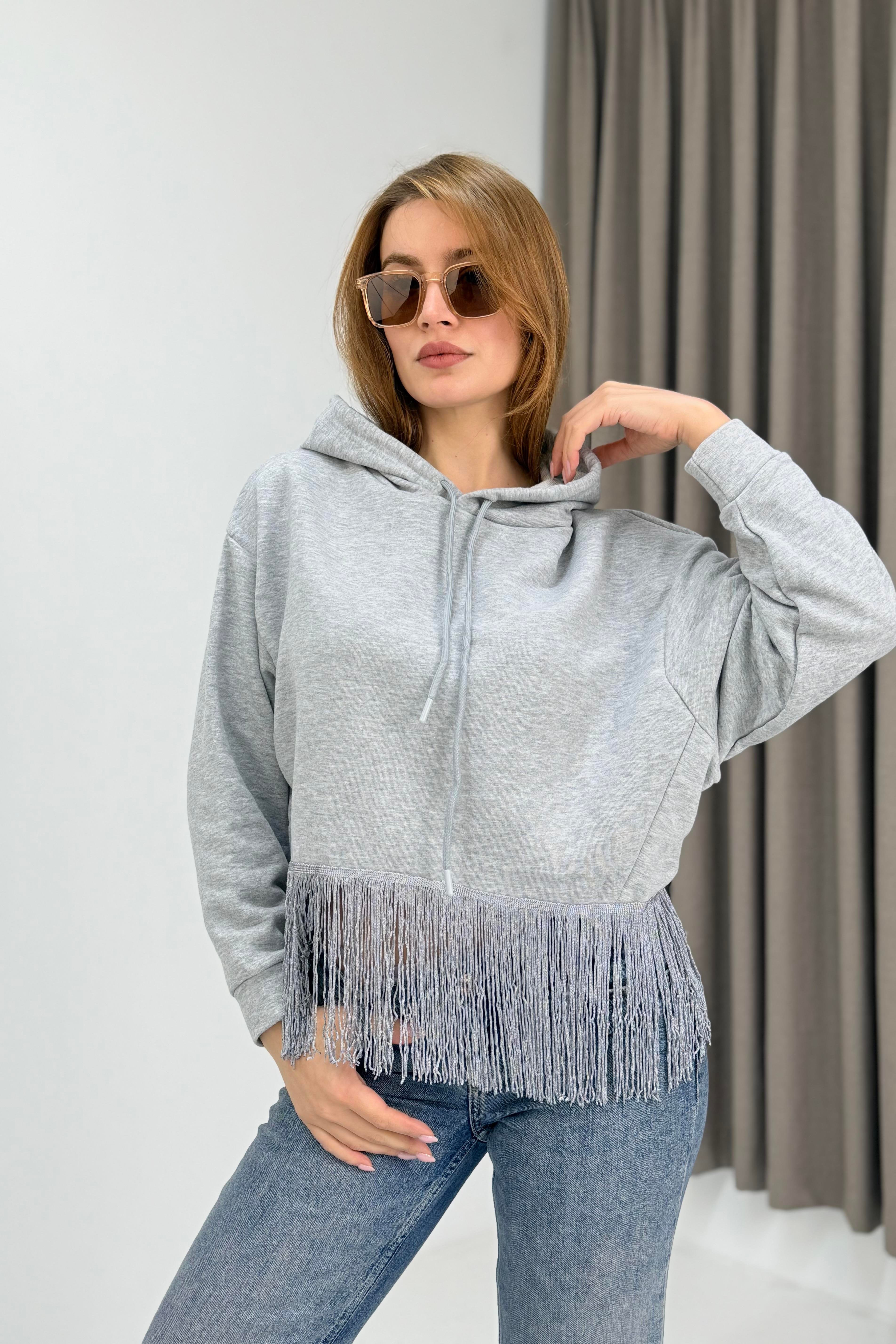 Kadın İp Saçaklı Kapuşonlu Sweatshirt Gri
