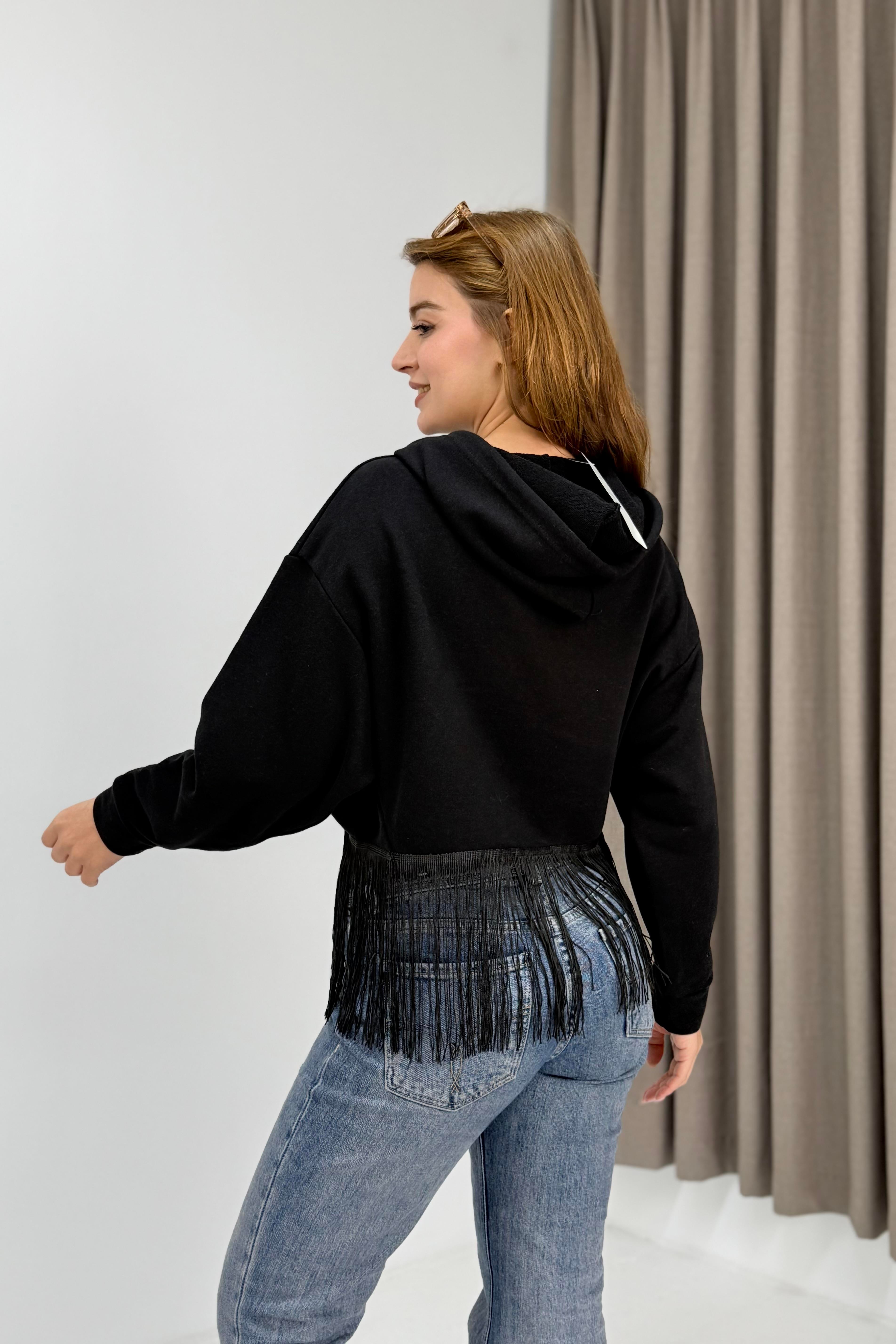 Kadın İp Saçaklı Kapuşonlu Sweatshirt Siyah