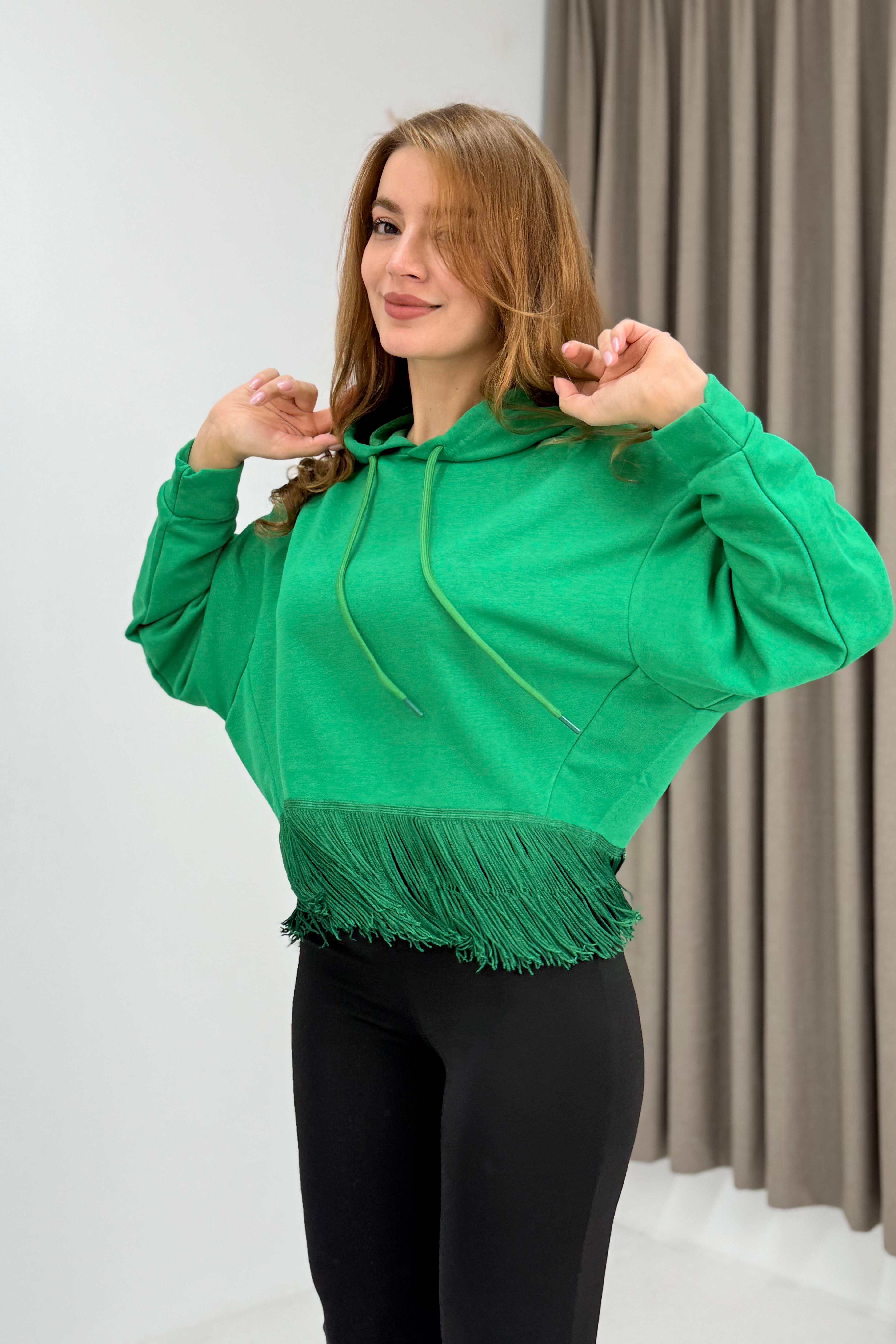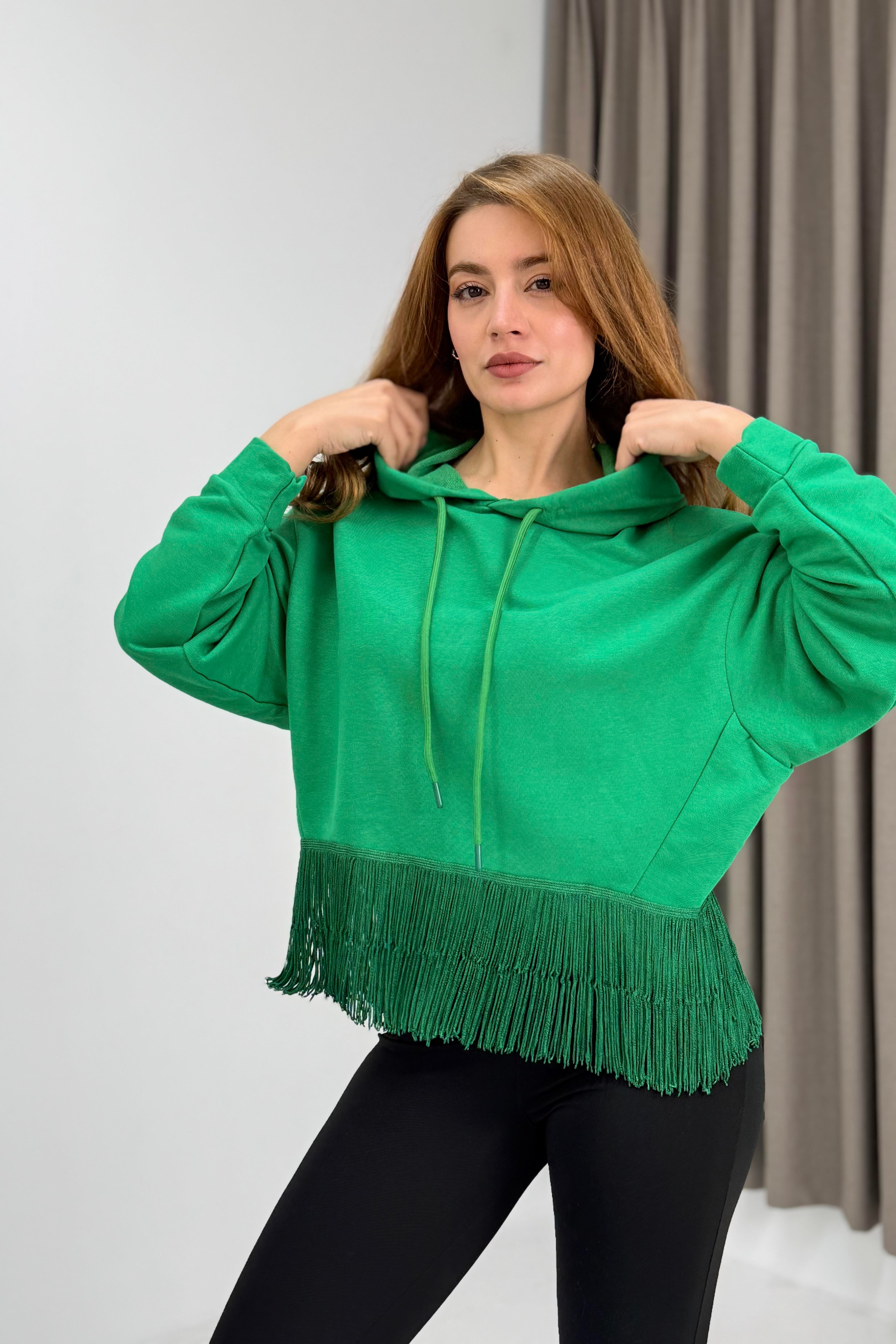 Kadın İp Saçaklı Kapuşonlu Sweatshirt Yeşil (500791SWTXYŞL)