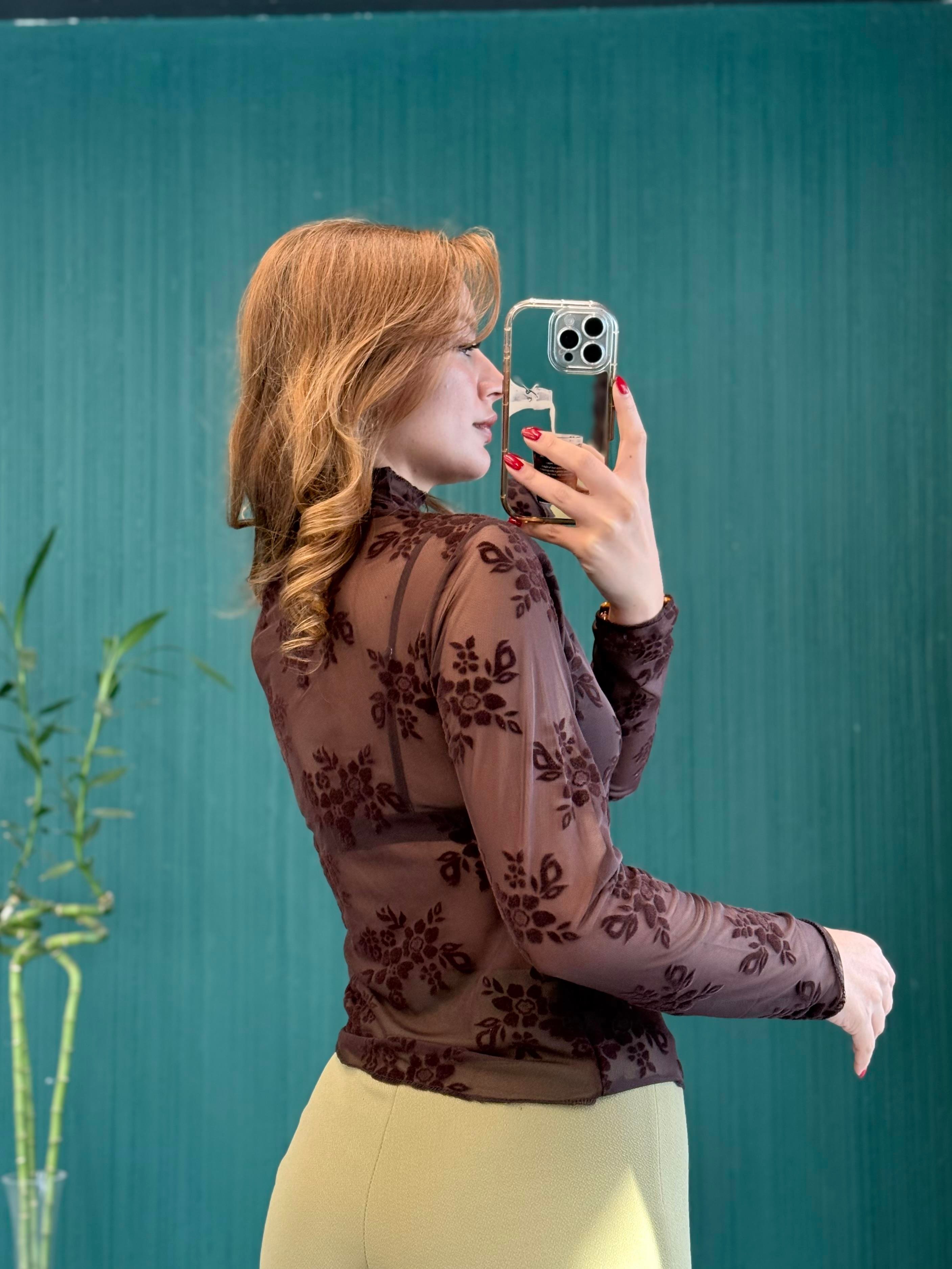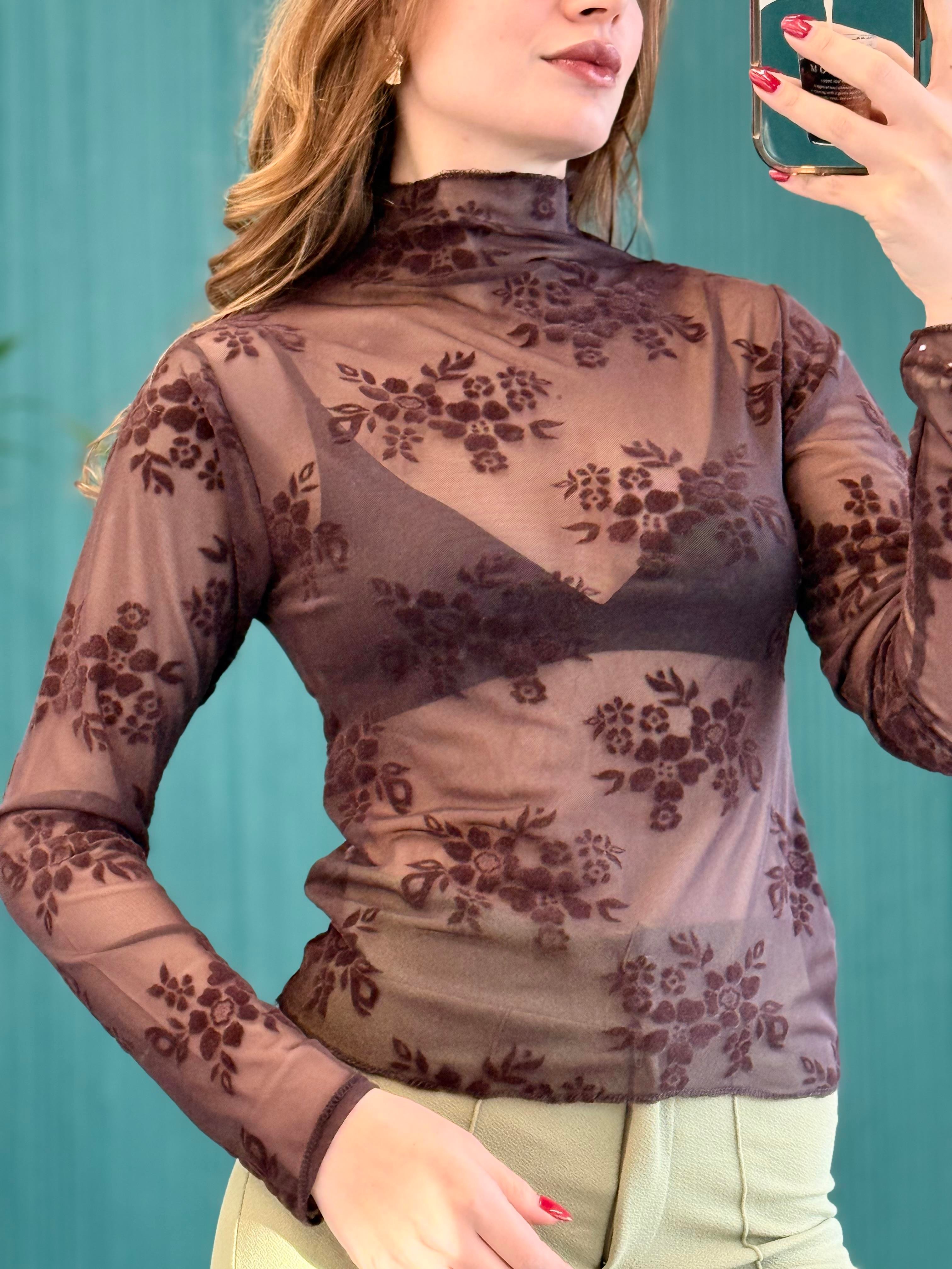 Kadın Kahverengi Transparan Çiçek Detaylı Uzun Kollu Bluz