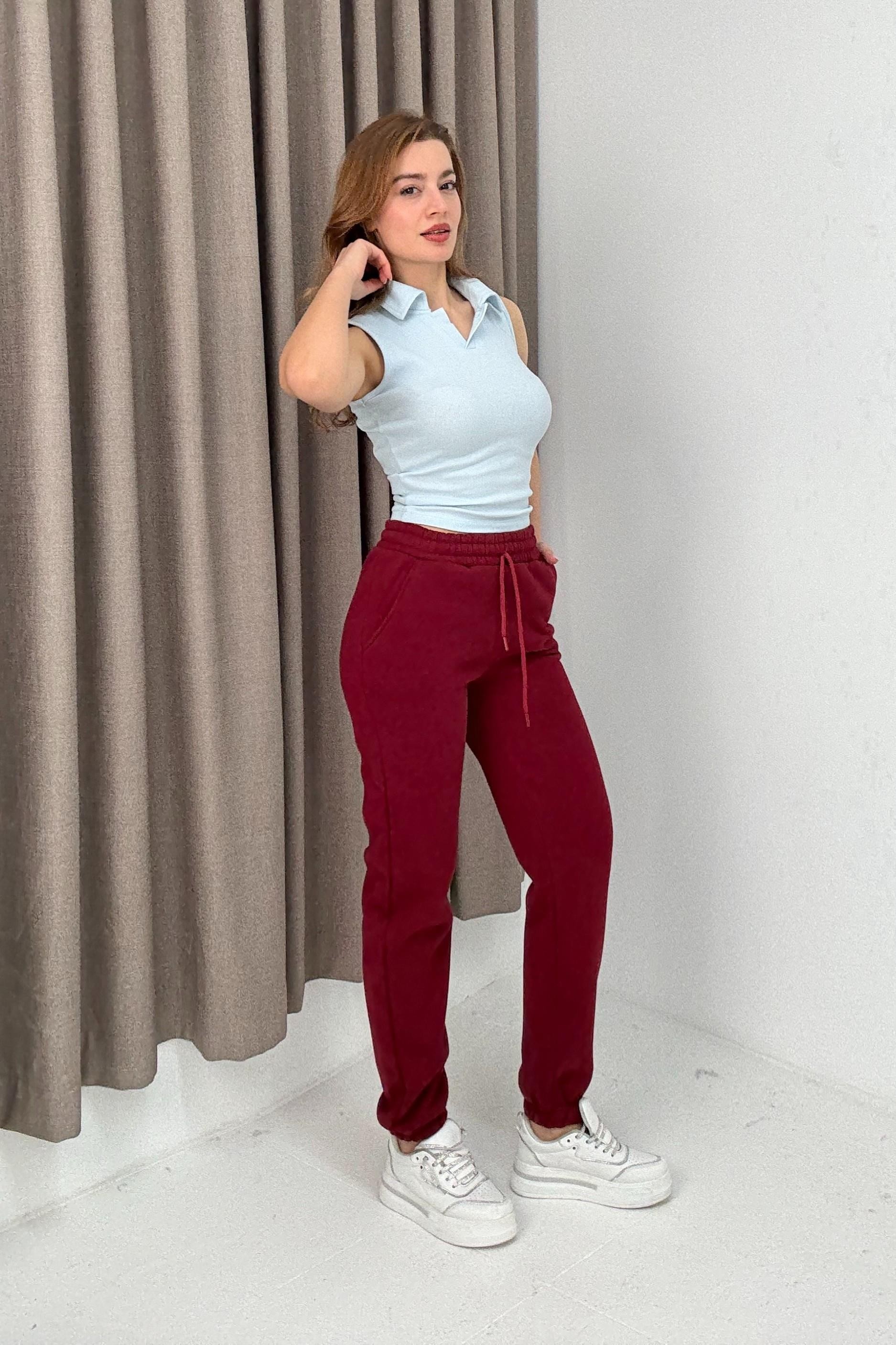 Kadın Kalın Kemerli Beli Paçası Lastikli Eşofman Altı Bordo (255010ESFXBRD)