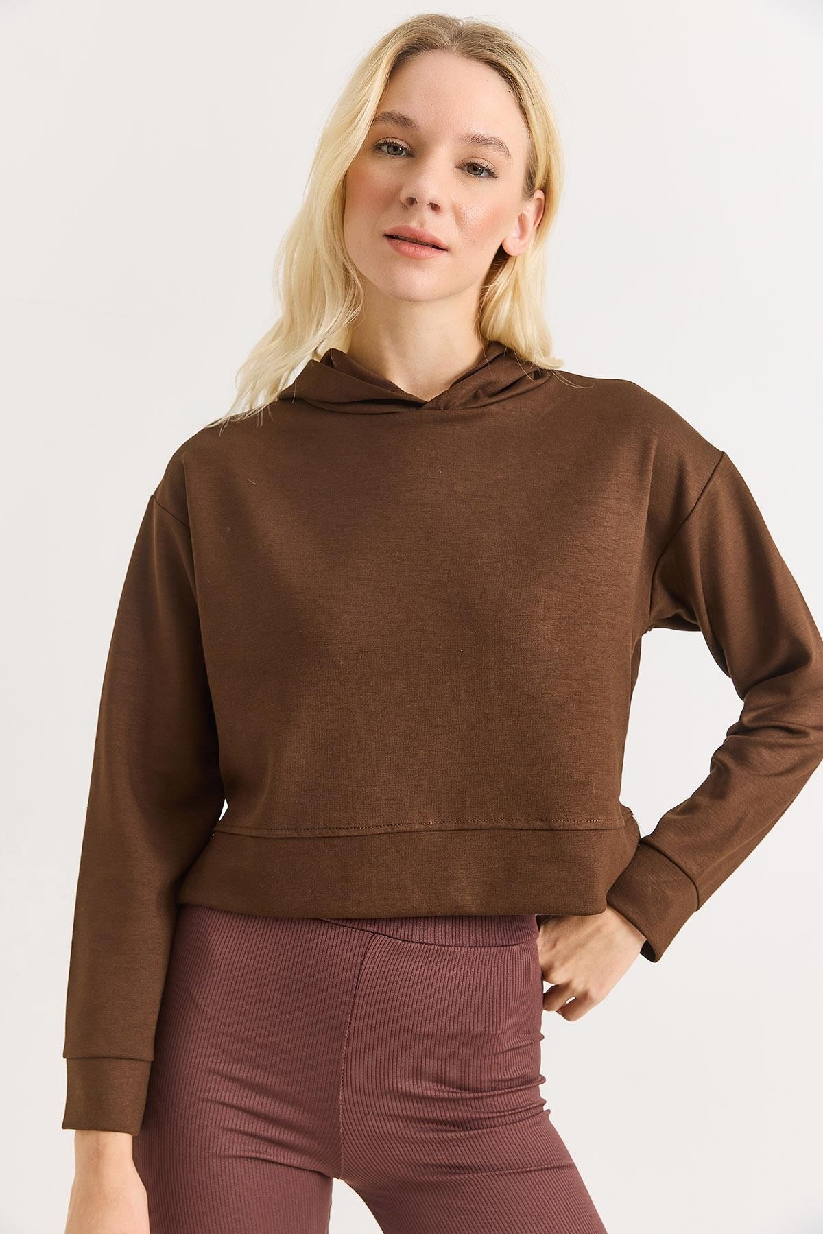 Kadın Kapişonlu Düz Rahat Swet Kahverengi (500790SWTXKHV)