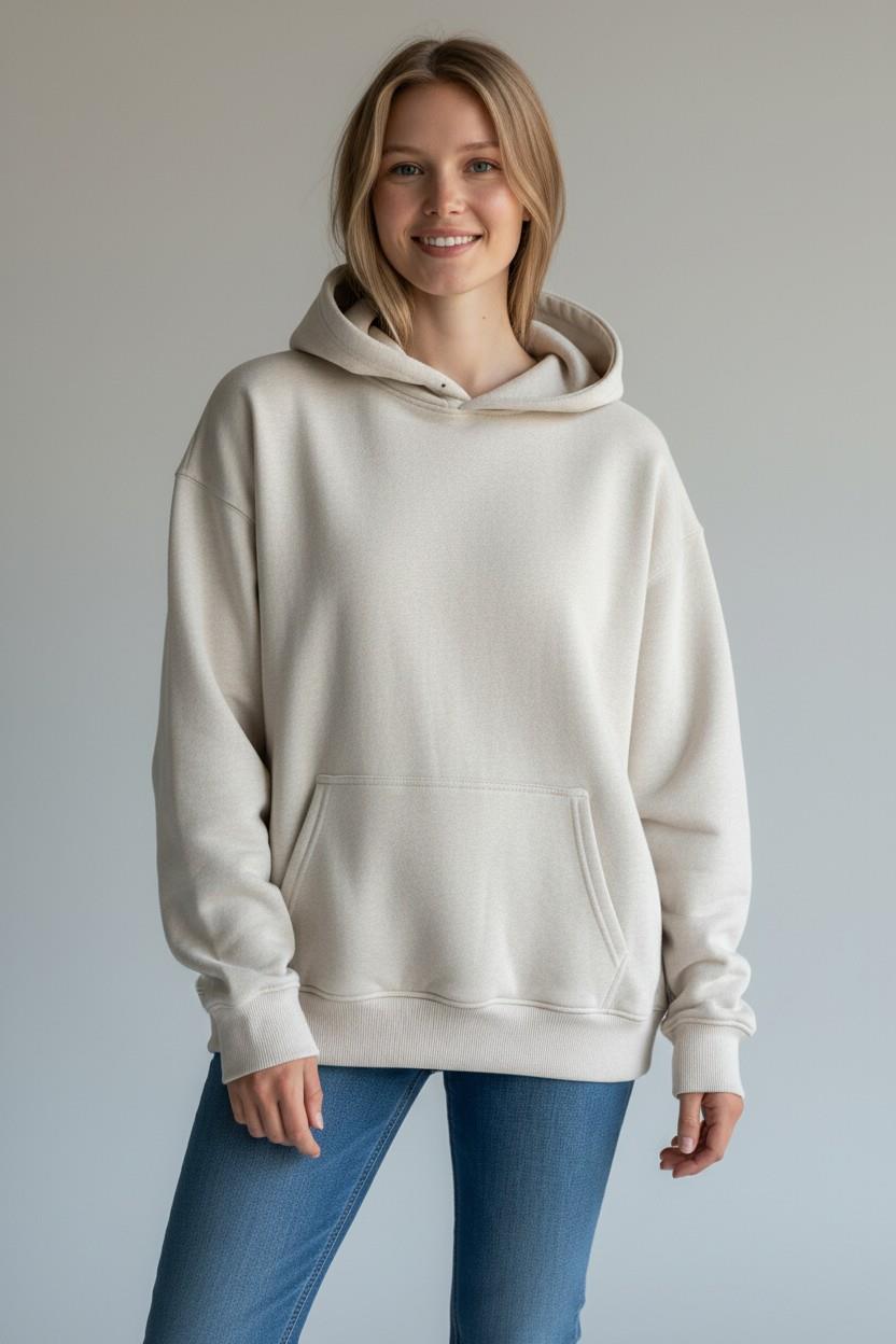 Kadın Kapüşonlu 3 İplik Şardonlu Krem Sweatshirt