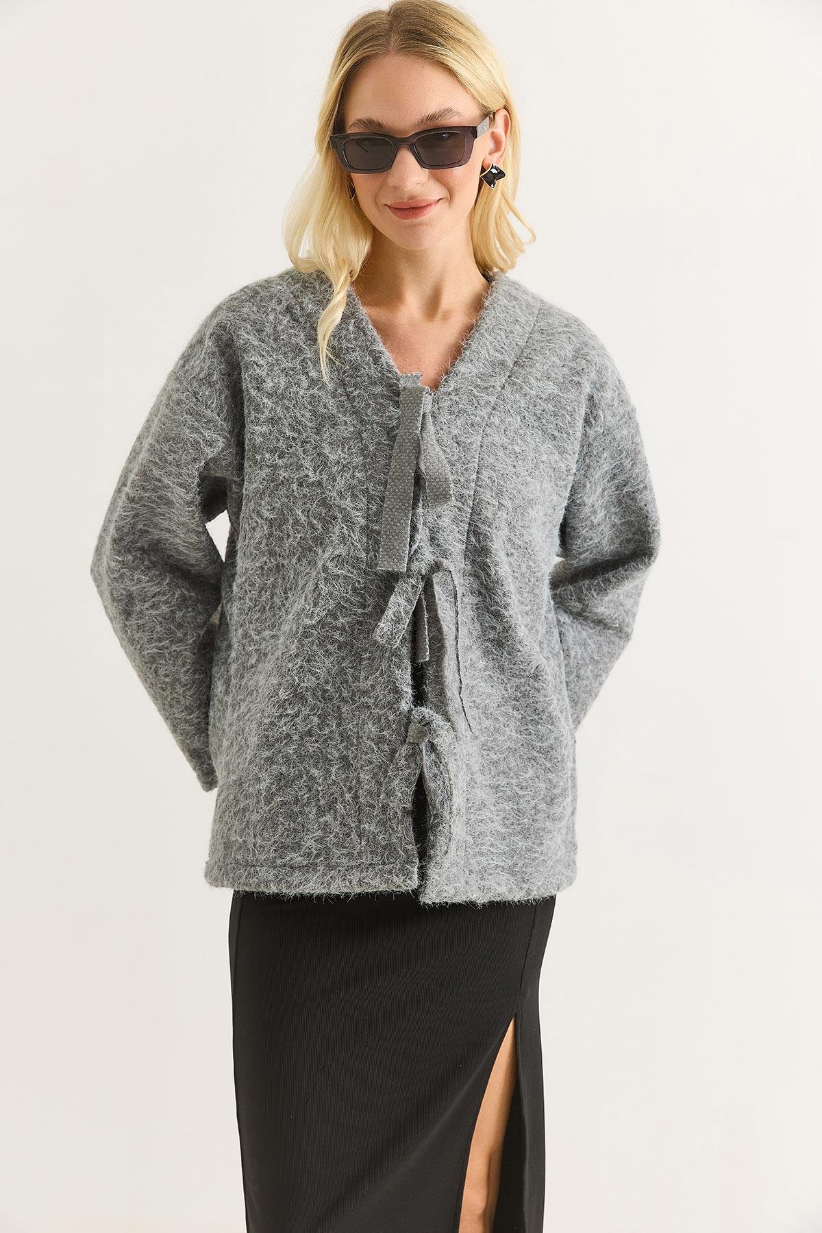 Kadın Kaşe Önden Bağlamalı Ceket Gri (500825CKTXGRİ)
