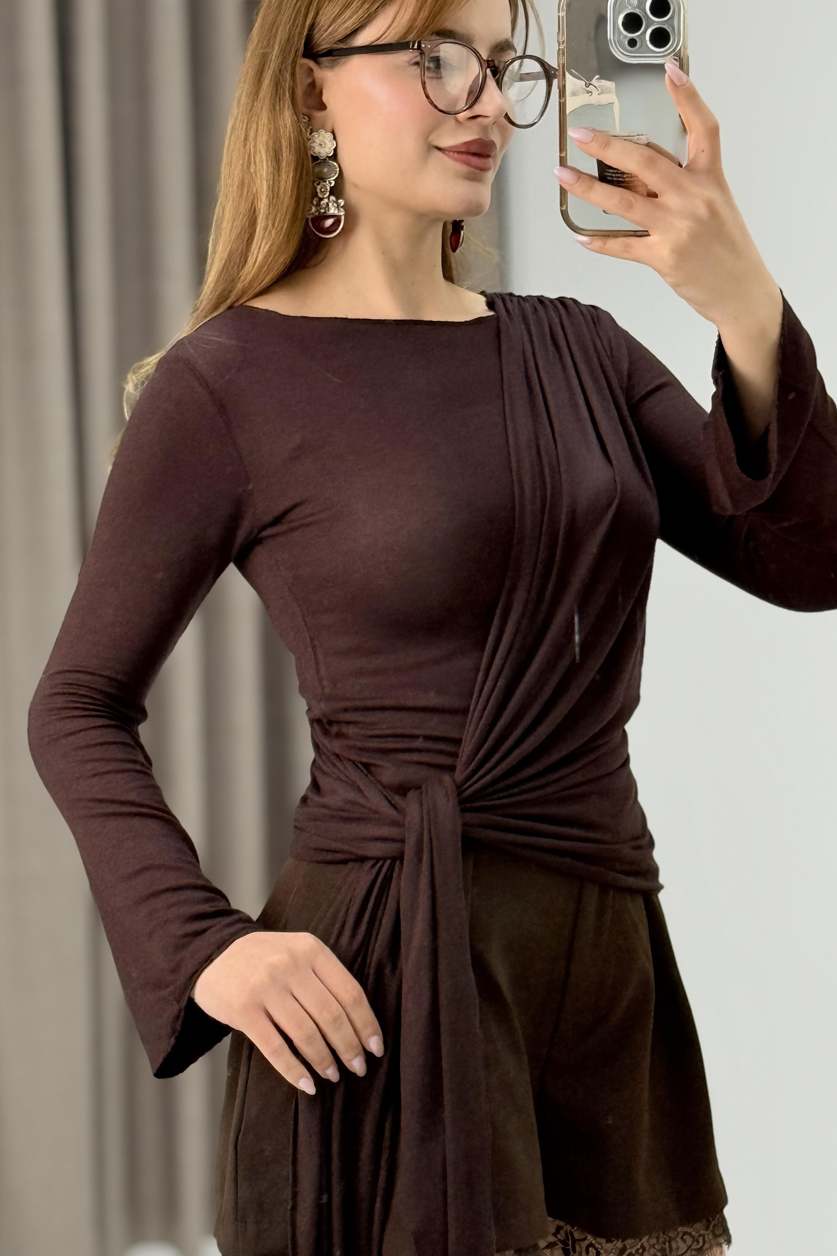 Kadın Kendinden Pelerinli Uzun Kollu Bluz Kahverengi