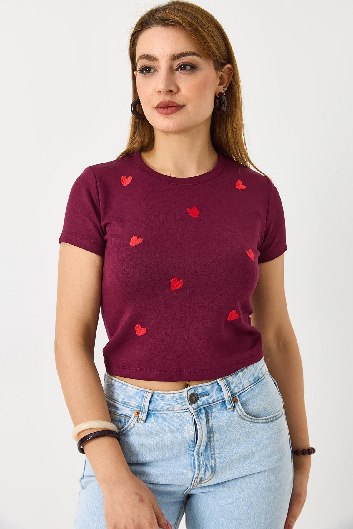 Kadın Kısa Kollu Kırmızı Kalp Baskılı Bordo