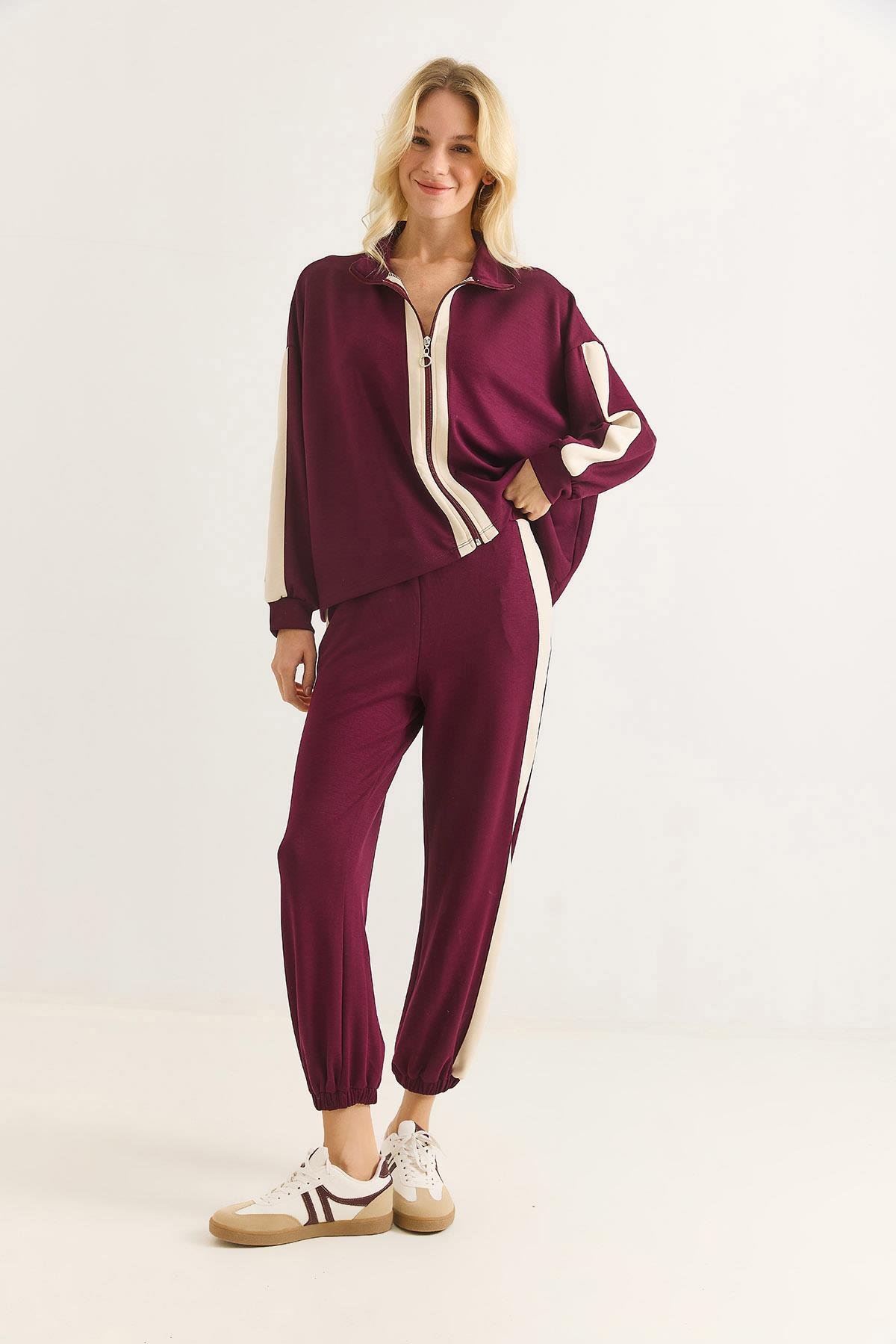 Kadın Kontrast Şeritli Örme Alt Üst Takım Bordo (500829TKMXBRD)