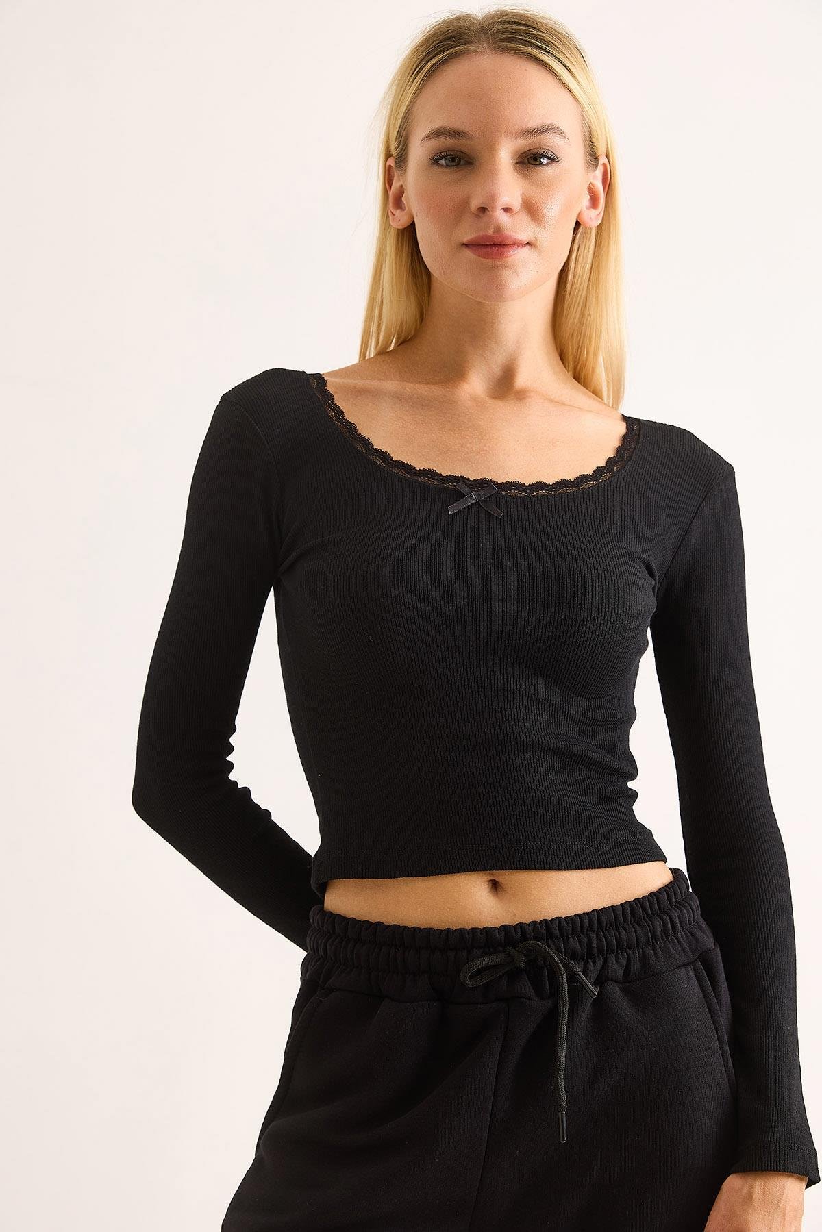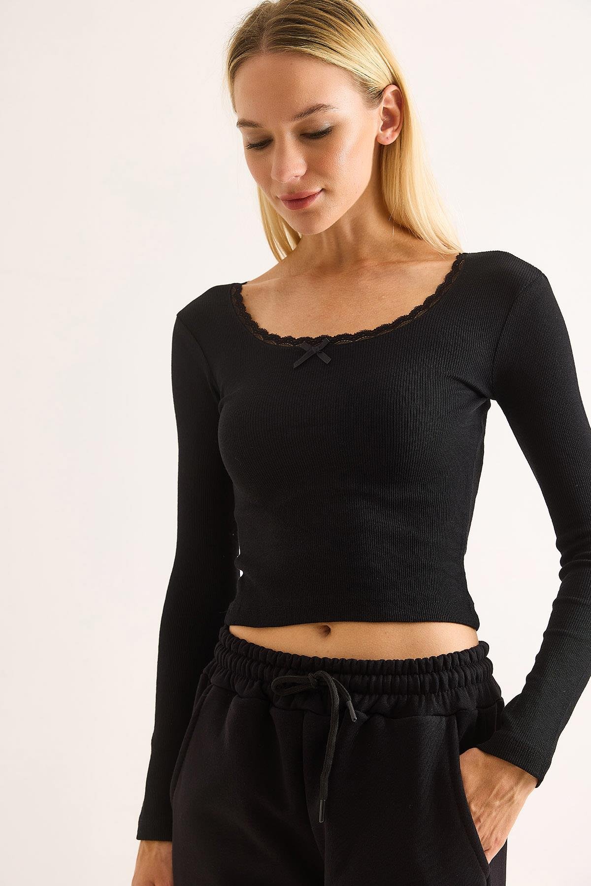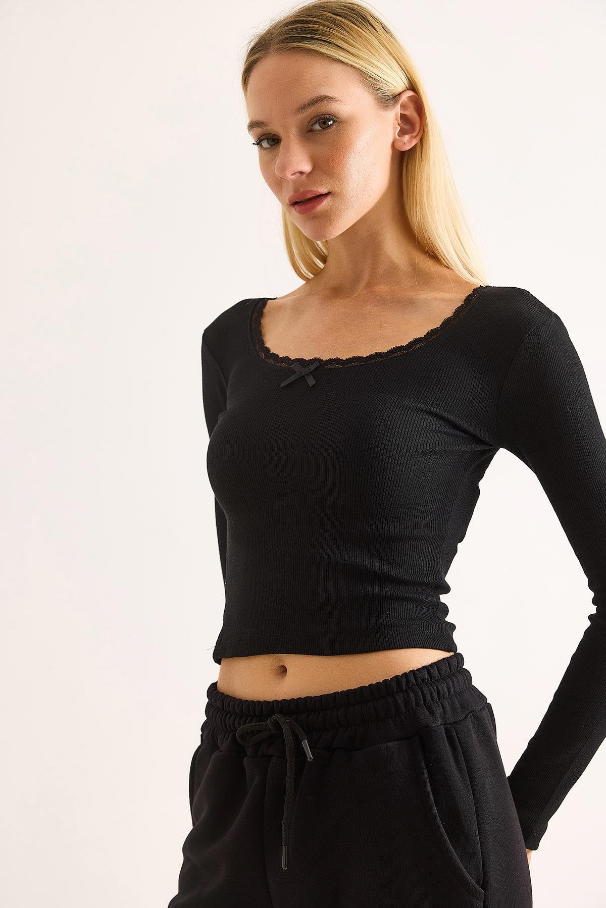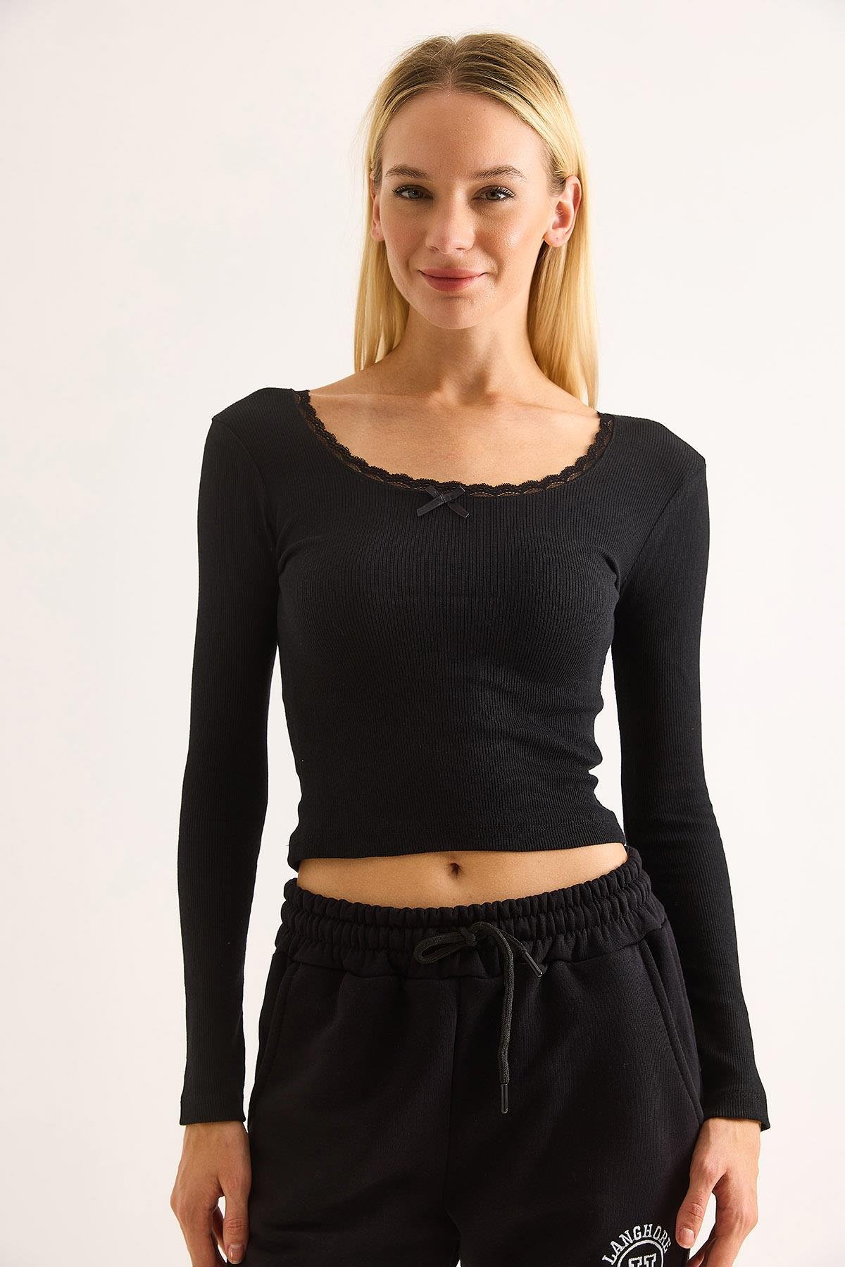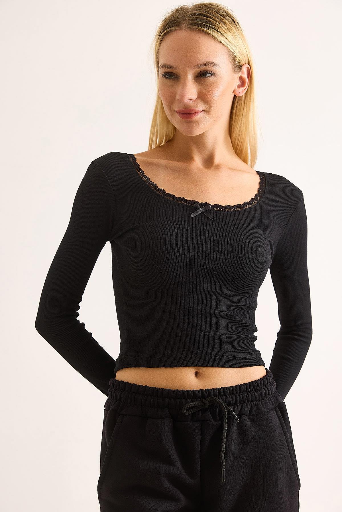 Kadın Kurdele Dantel Detaylı Siyah Bluz (500776BLZXSYH)
