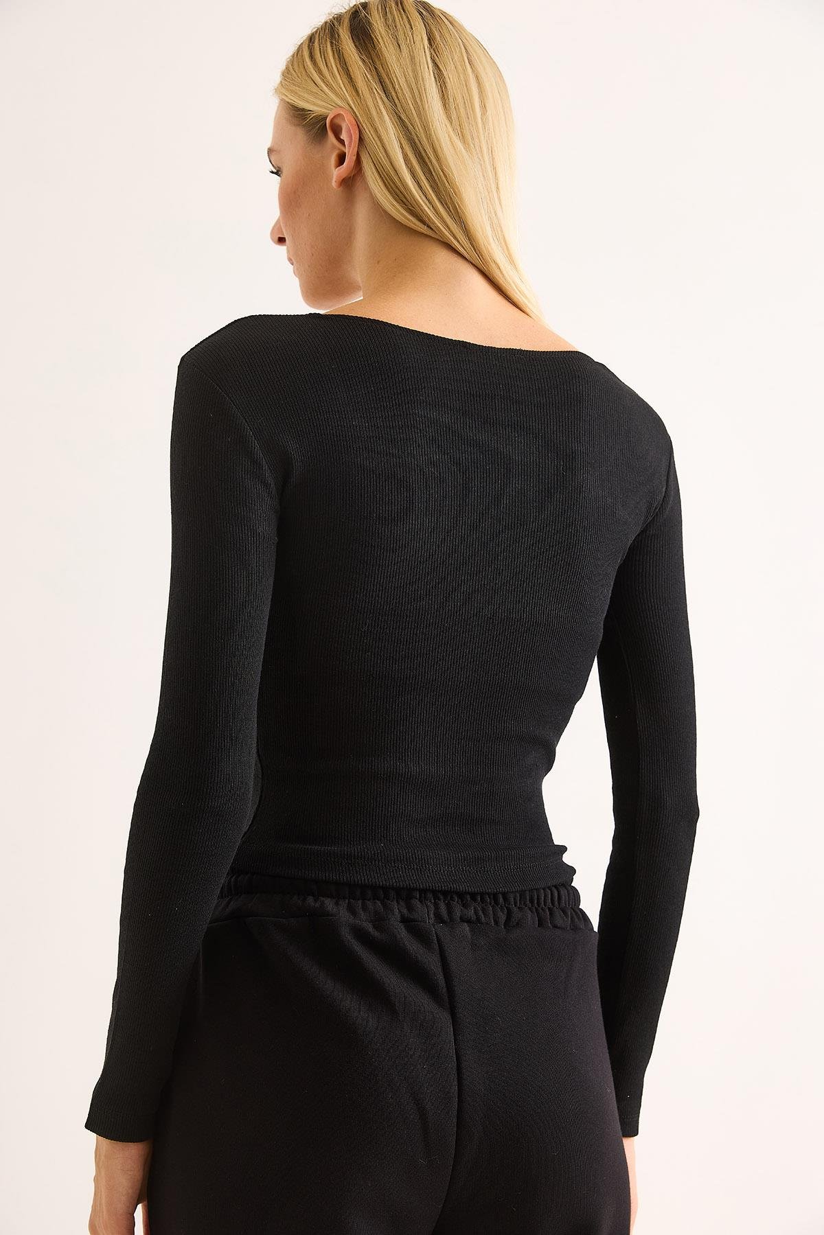 Kadın Kurdele Dantel Detaylı Siyah Bluz