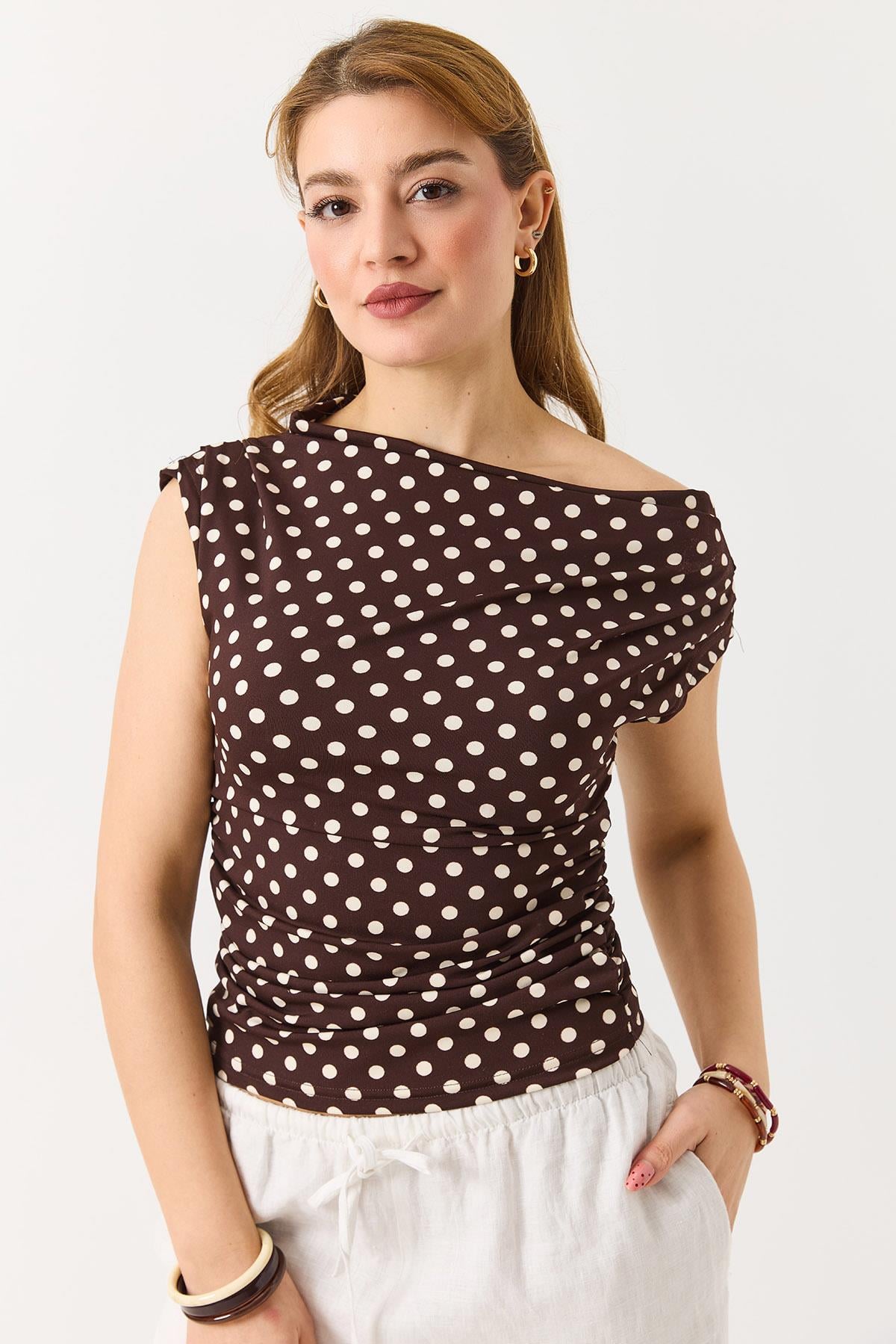 Kadın Omuz Ve Beli Büzgülü Puantiyeli Bluz Kahverengi (255268BLZXKHV)
