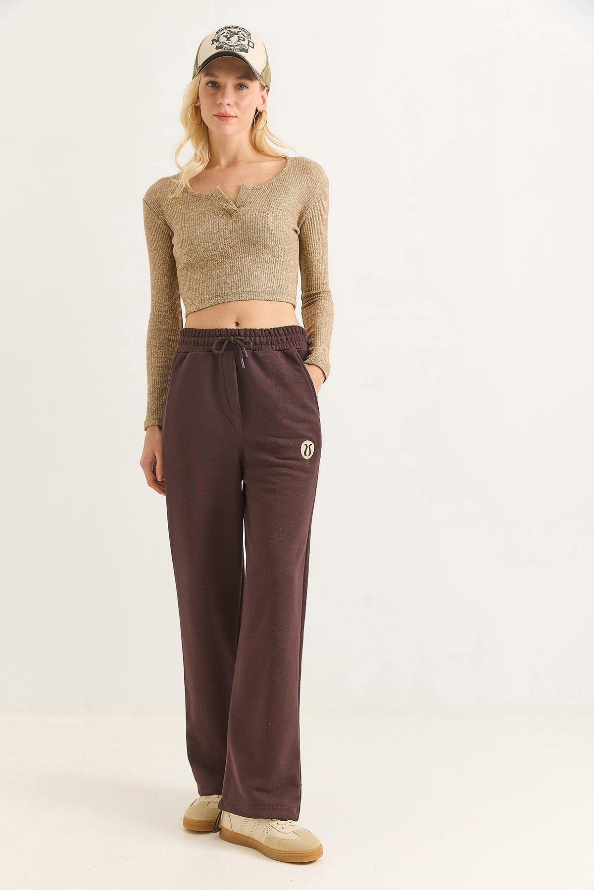 Kadın Paçası Lastıkli Geniş Paça Eşofman Altı Kahverengi (500826EŞFXKHV)