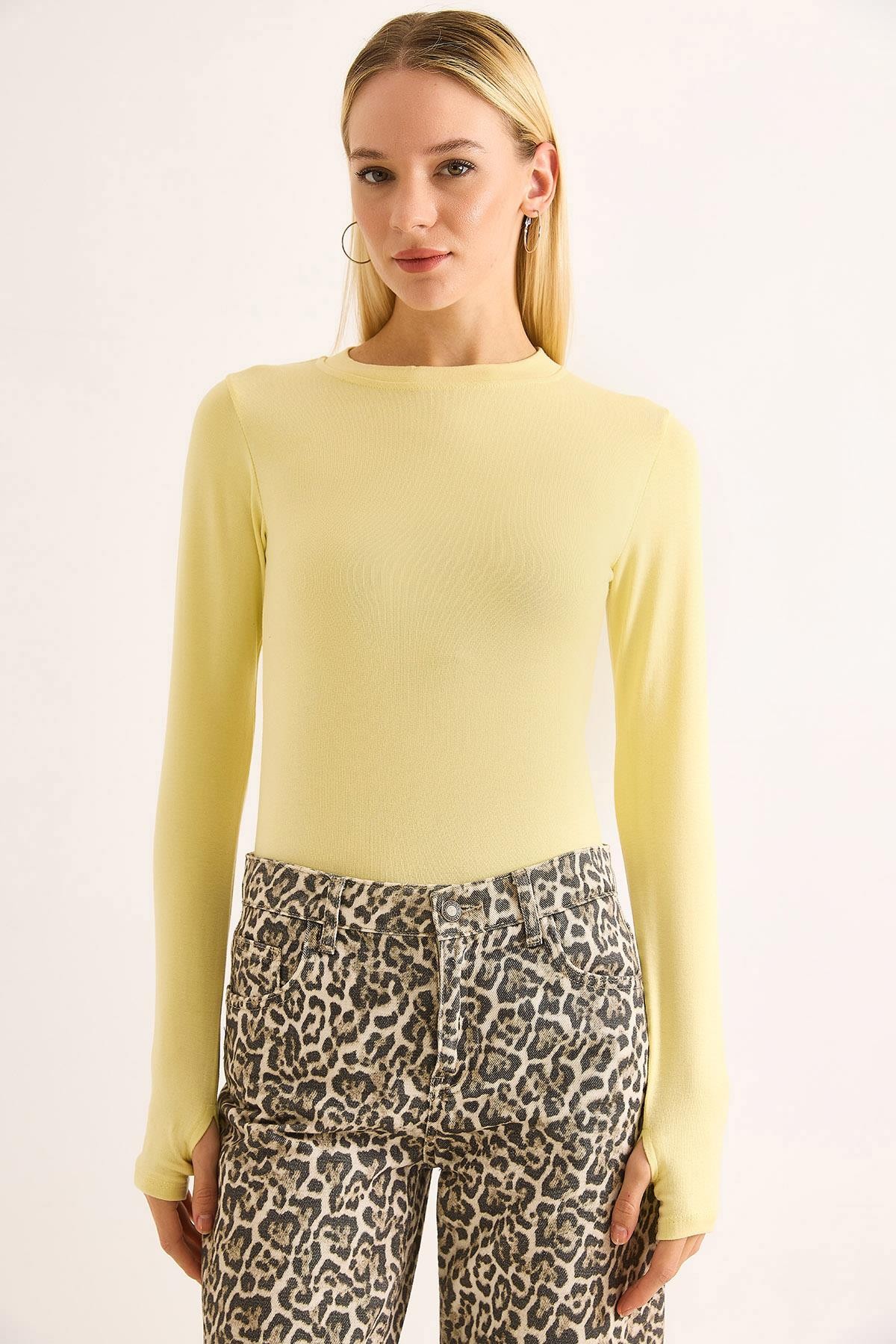 Kadın Parmak Geçirmeli Uzun Kollu Düz BLuz Sarı (500773BLZXSRI)