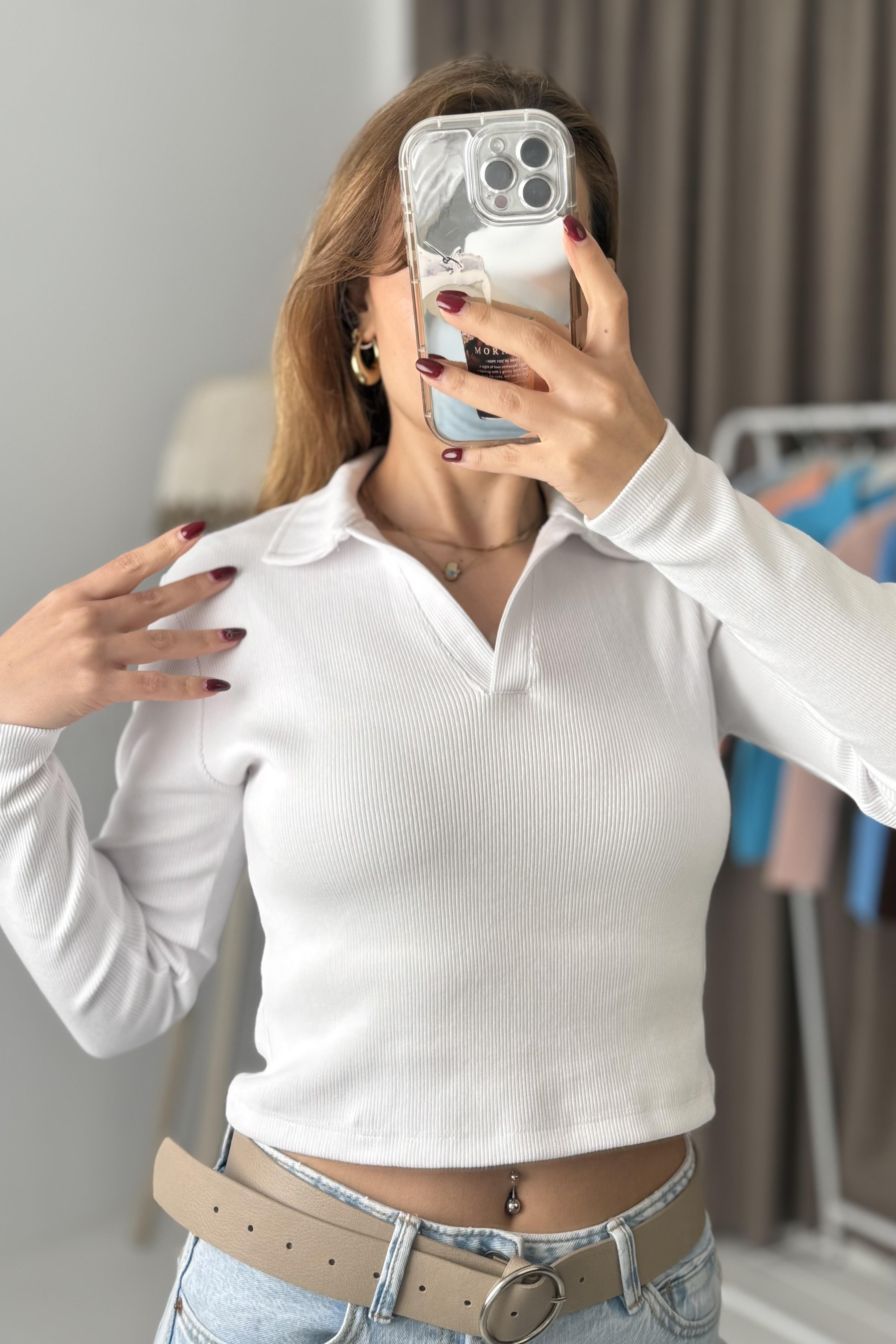 Kadın Polo Yaka Fitilli Crop Bluz Beyaz