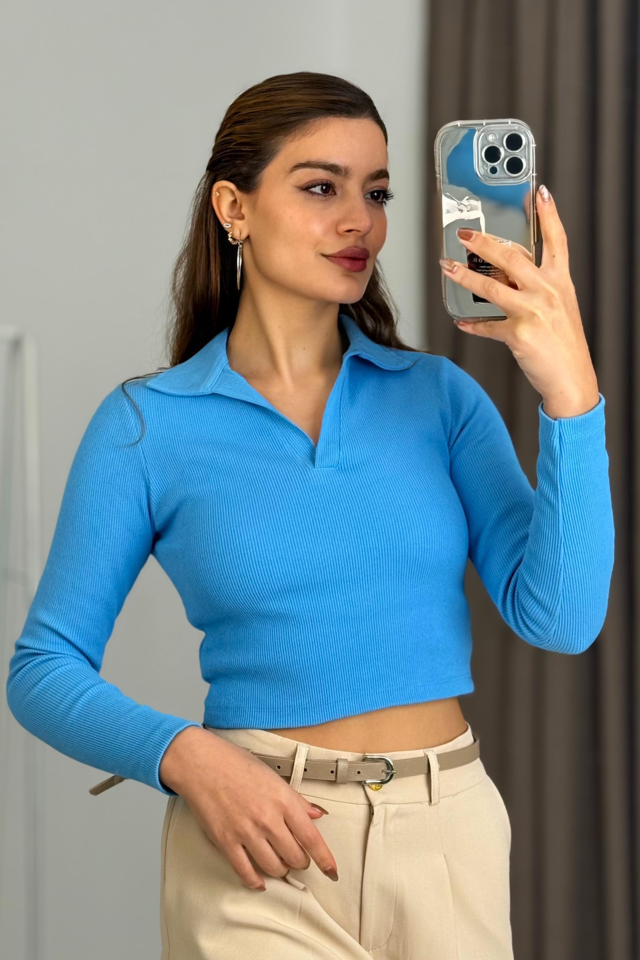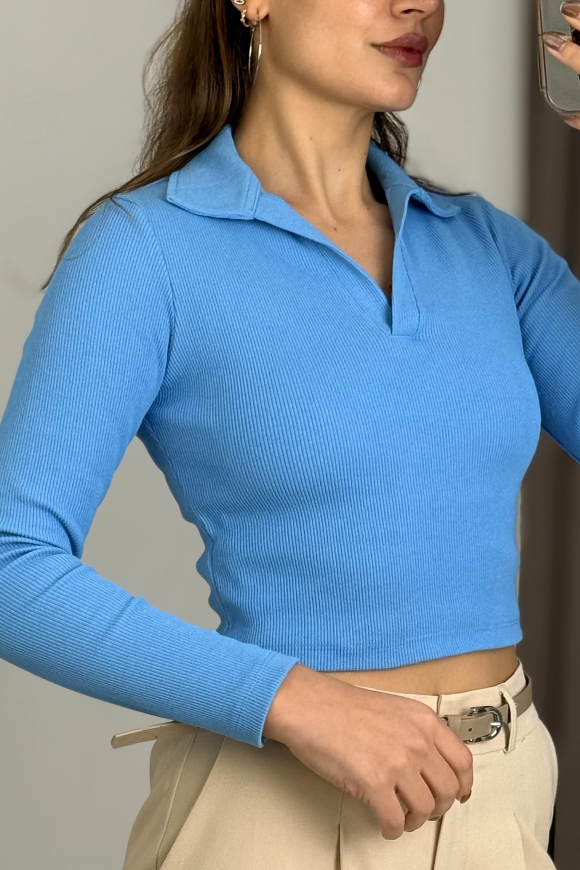 Kadın Polo Yaka Fitilli Crop Bluz Mavi (500998BLZXMAVİ)