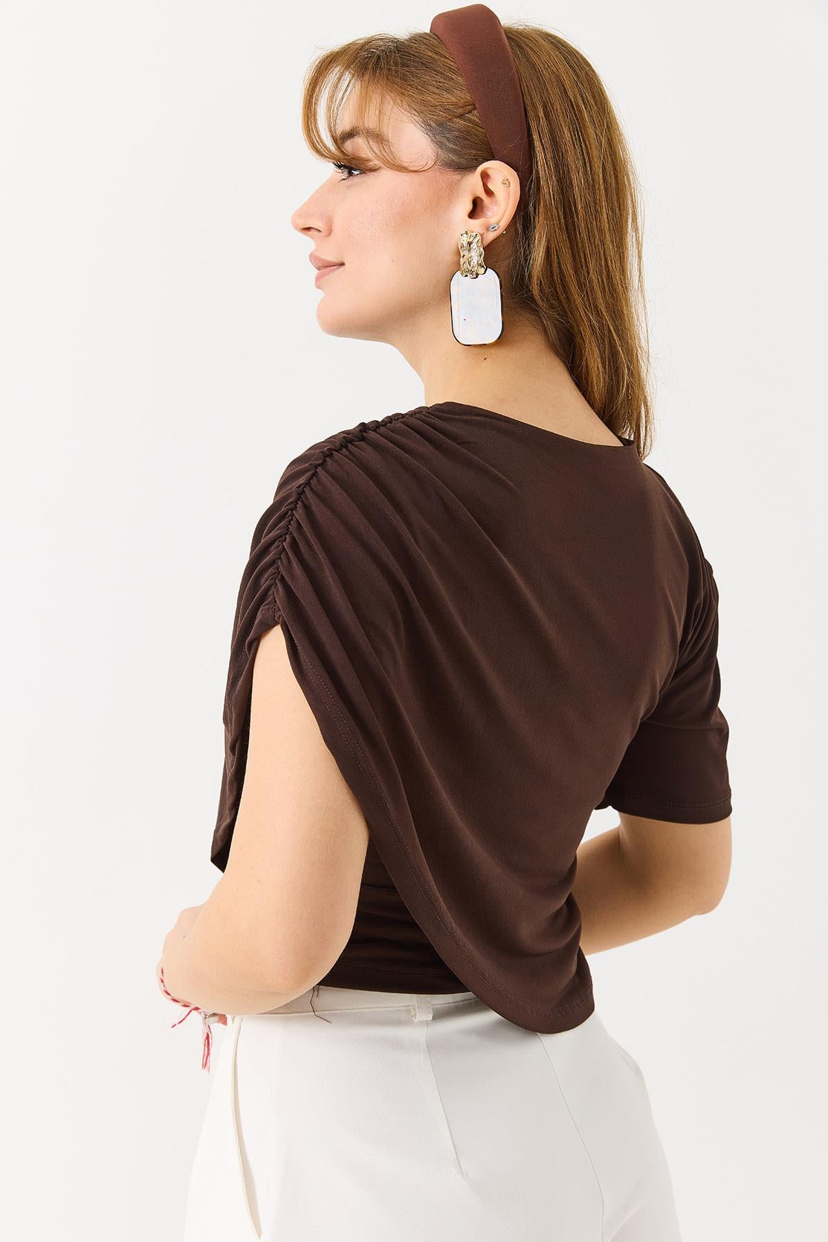 Kadın Sandy Pelerinli Yarım Kollu Bluz Kahverengi (600642BLZXKHV)