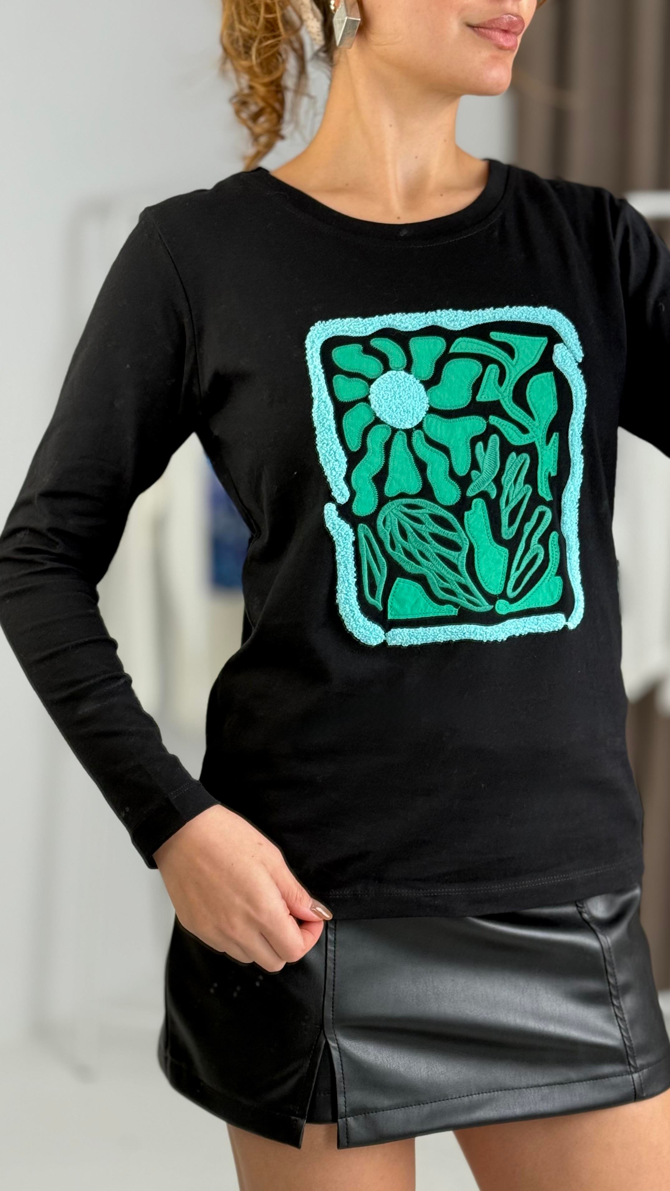 Kadın Siyah Yeşil  Baskılı Uzun Kollu Tshirt