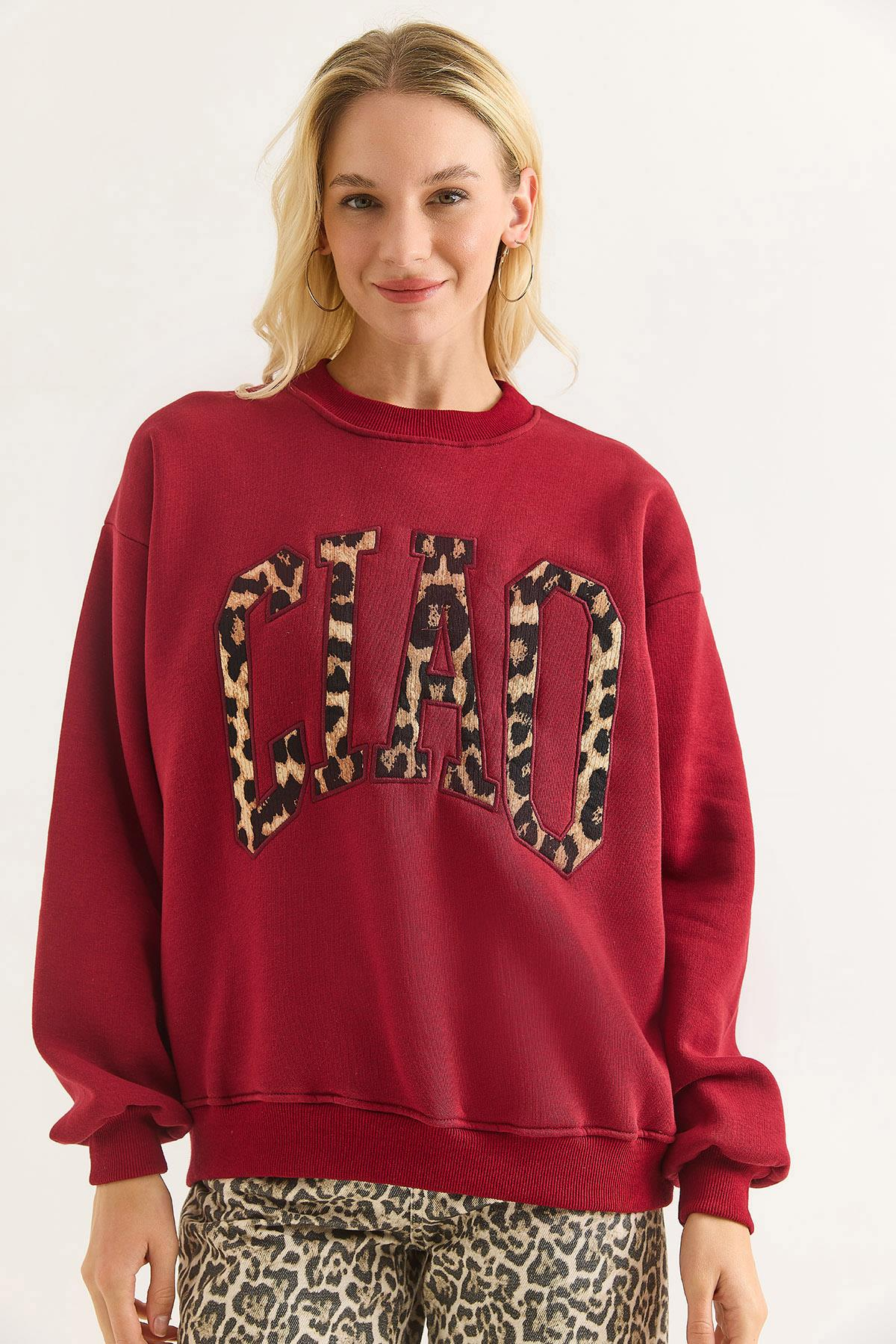Kadın Üç İplik Leopar Baskılı Sweatshirt Bordo (500813SWTXBRD)