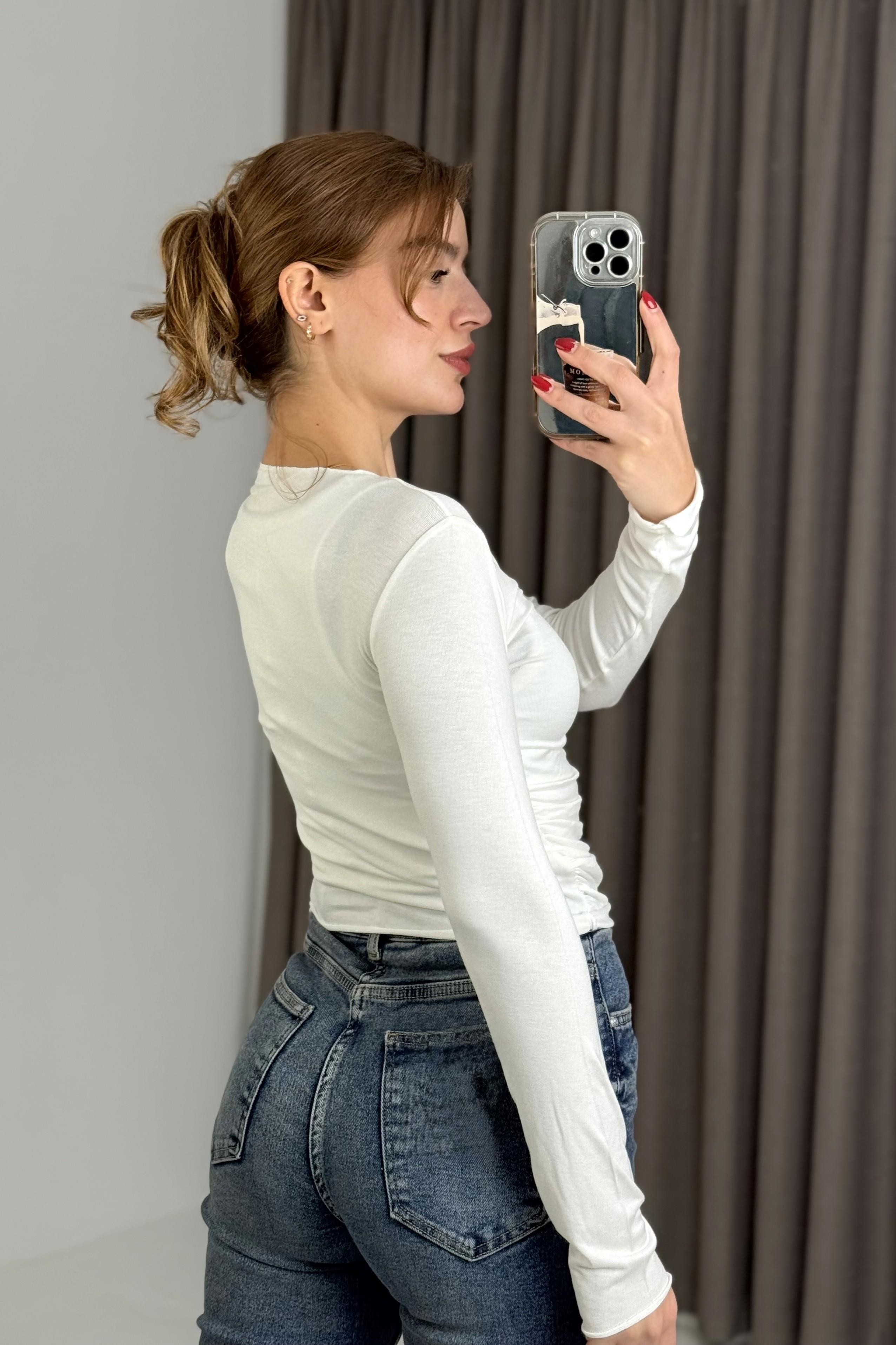 Kadın Uzun Kollu V Yaka Büzgü Detaylı Bluz Beyaz (255003BLZXBYZ)