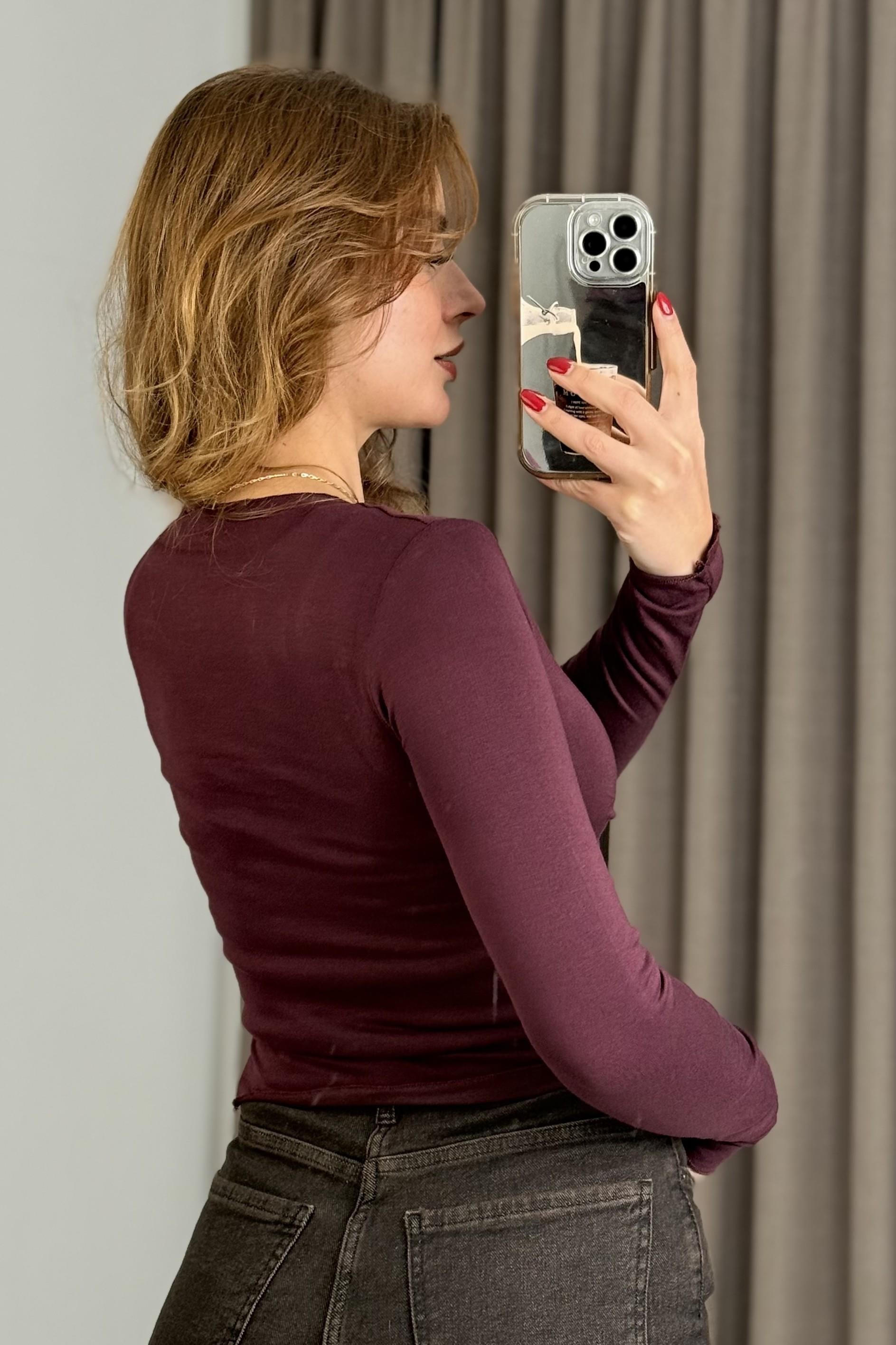 Kadın Uzun Kollu V Yaka Büzgü Detaylı Bluz Mürdüm (255003BLZXMRD)