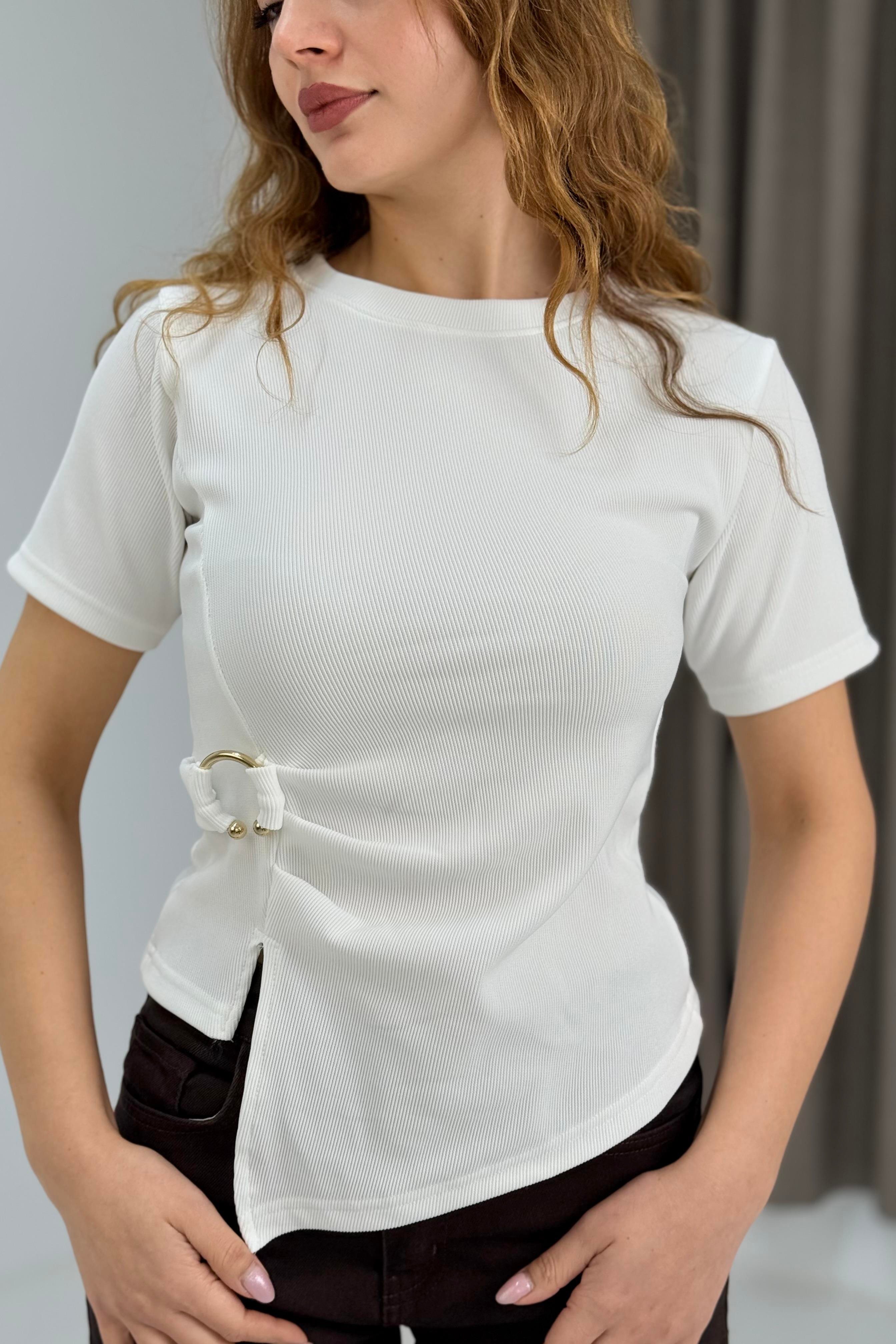 Kadın Yan Tokalı Asimetrik Kesim Kakorse Kısa Kollu Bluz Beyaz (600246BLZXBYZ)