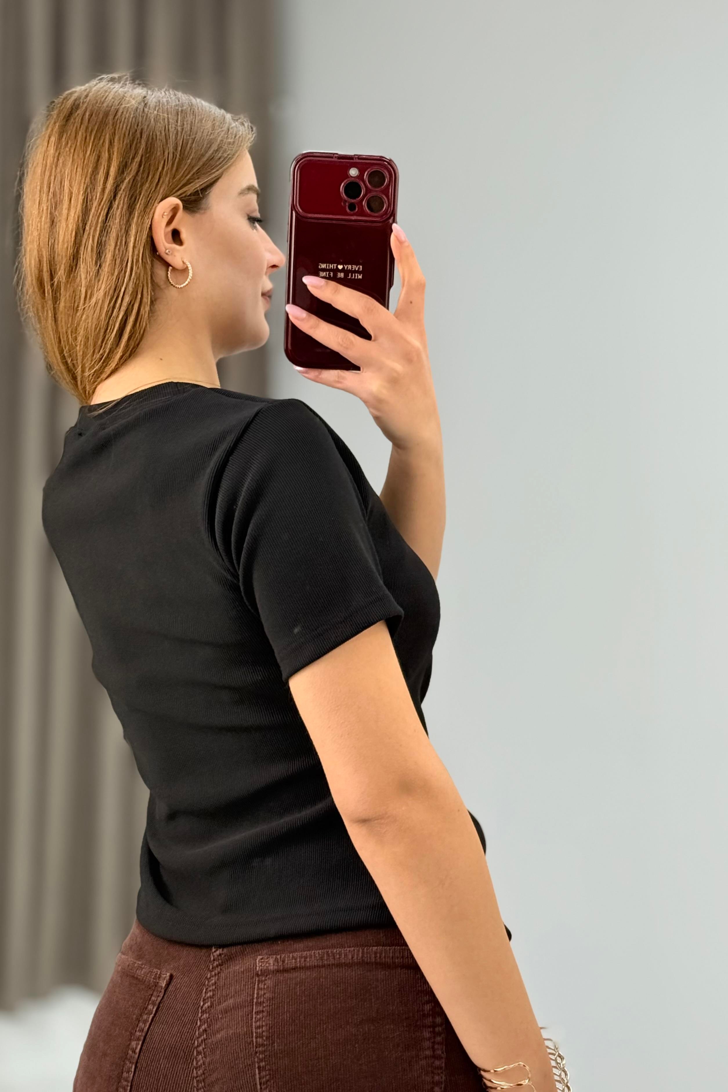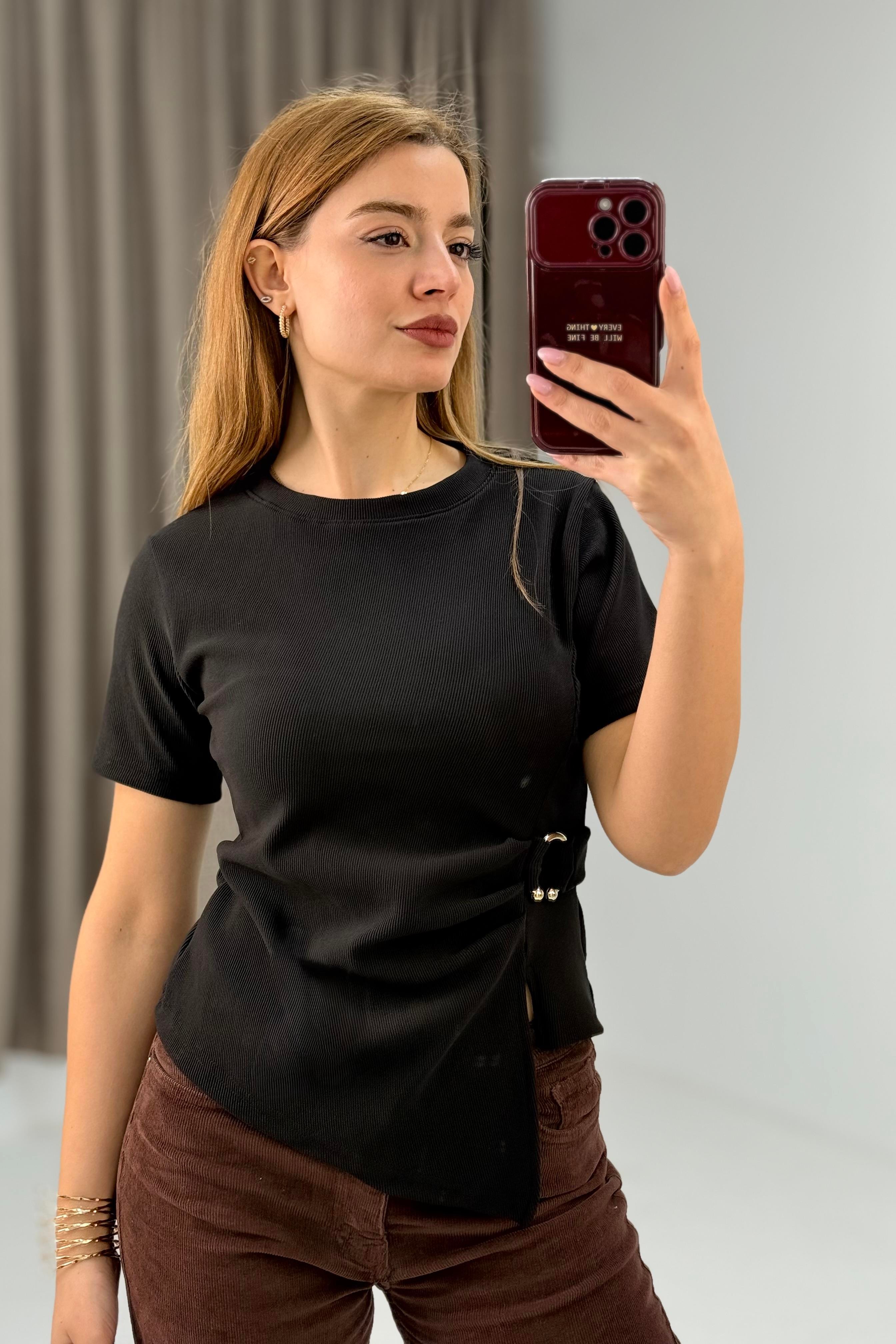 Kadın Yan Tokalı Asimetrik Kesim Kakorse Kısa Kollu Bluz  Siyah