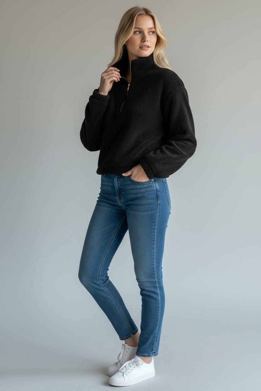 Kadın Yarım Fermuarlı Altı Büzgülü Siyah Sweatshirt