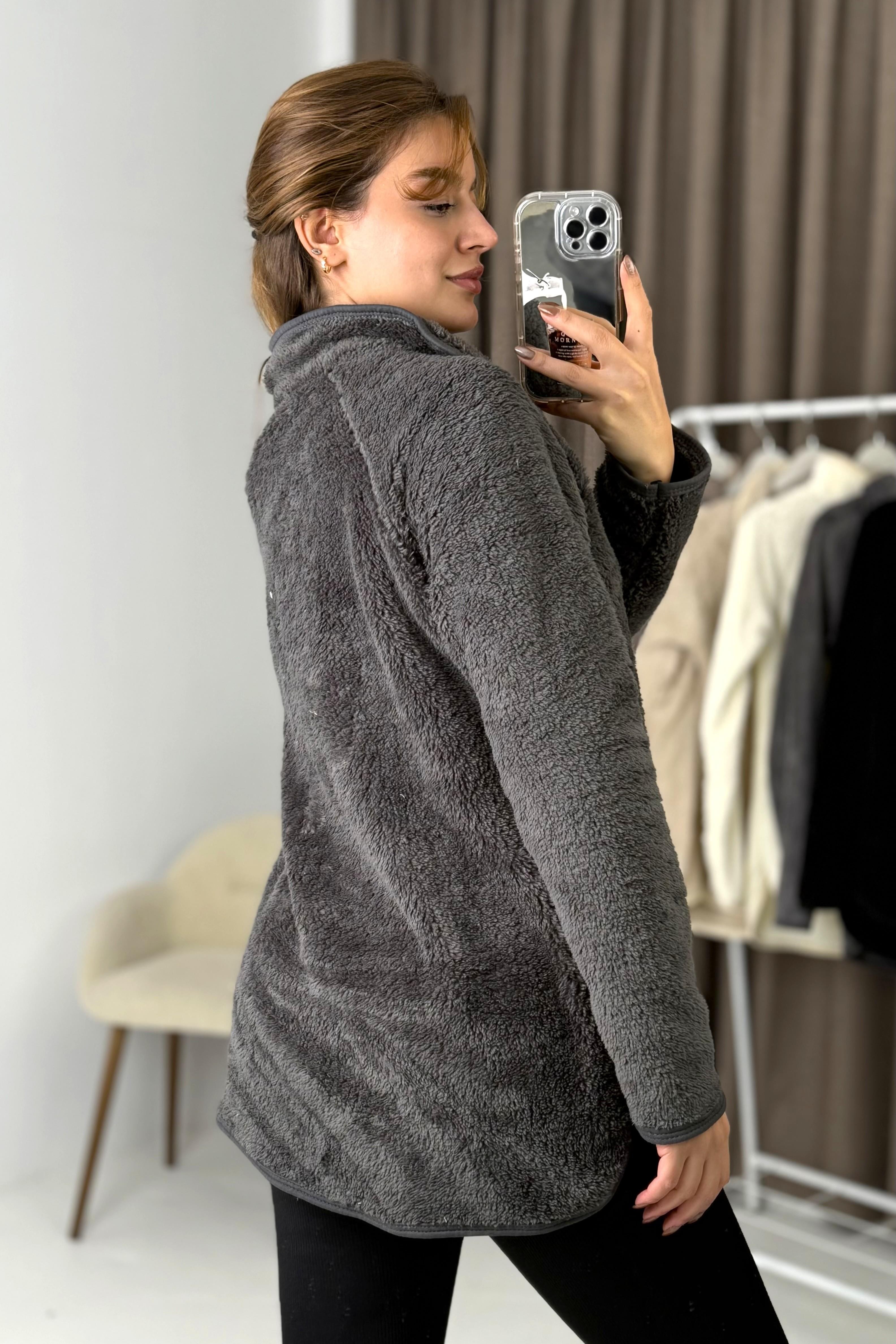 Kadın Yarım Fermuarlı  Welsoft Peluş Antrasit Sweatshirt