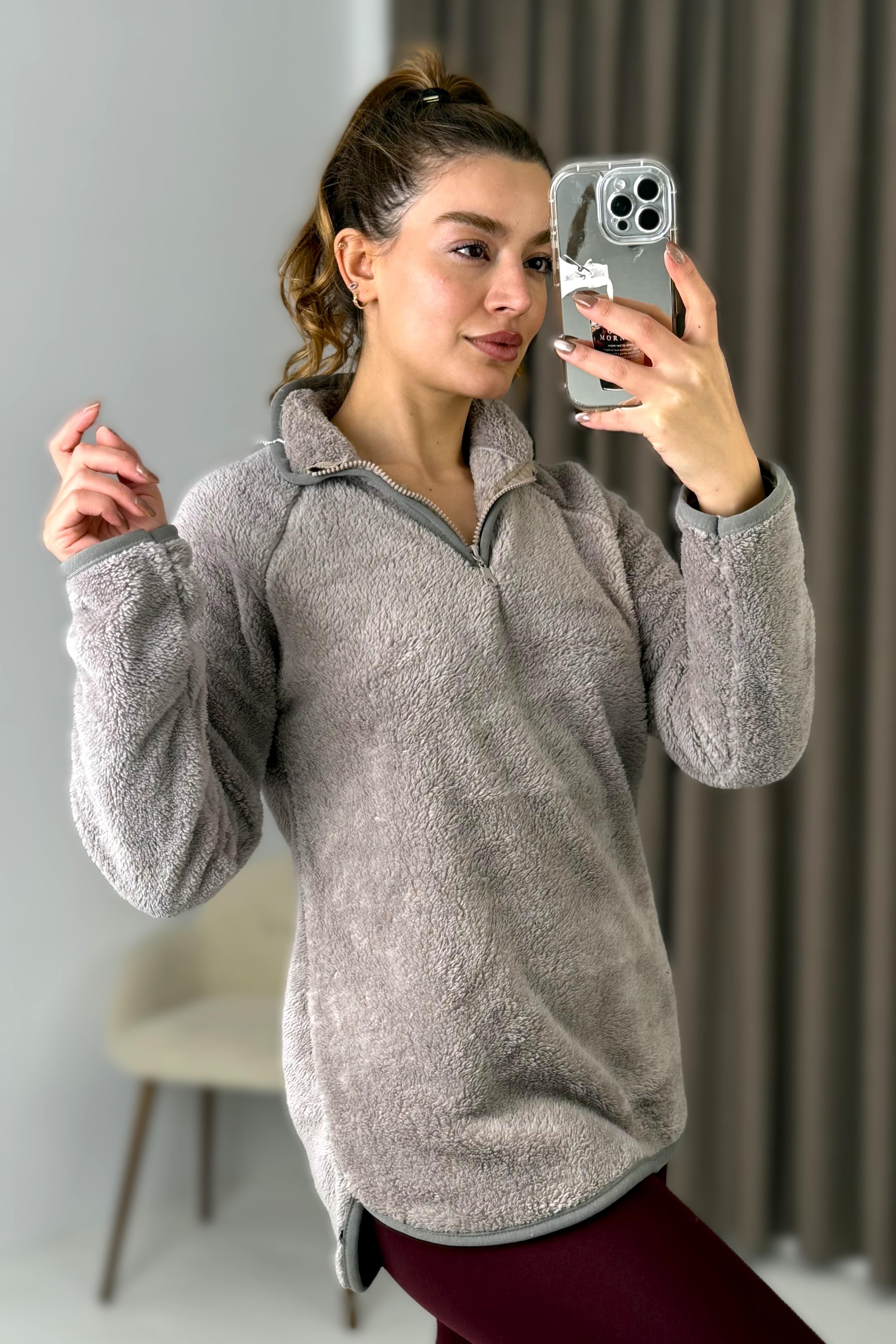 Kadın Yarım Fermuarlı Welsoft Peluş Gri Sweatshirt (252615SWTXGRİ)